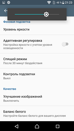 При ручном управлении яркостью и при выводе белого поля во весь экран ее максимальное значение составило порядка 610 кд/м², а минимальное — 5,4 кд/м². Максимальное значение очень высокое, и, учитывая отличные антибликовые свойства, при ярком дневном свете и даже на прямом солнце изображение на экране должно быть хорошо различимым. В полной темноте яркость можно понизить до комфортного уровня. Работает автоматическая регулировка яркости по датчику освещенности (он расположен правее и ниже прорези фронтального громкоговорителя). В автоматическом режиме при изменении внешних условий освещенности яркость экрана как повышается, так и понижается. Работа этой функции зависит от положения регулировки яркости, им пользователь может попытаться выставить желаемый уровень яркости в текущих условиях. Если в условиях офиса ползунок яркости вывести на максимум, то в полной темноте функция автояркости уменьшает яркость до 5 кд/м² (темновато), в условиях освещенного искусственным светом офиса (примерно 400 лк) устанавливает на 610 кд/м² (чрезмерно ярко), в очень ярком окружении (соответствует освещению ясным днем вне помещения, но без прямого солнечного света — 20000 лк или немного больше) повышает до 610 кд/м² (до максимума, что и нужно). Если все также в условиях офиса ползунок яркости на половине шкалы, то яркость экрана для трех условий, указанных выше, следующая: 5, 250 и 510 кд/м² (первое значение низковато, второе — высоковато). Если регулятор яркости установлен на минимум — 5, 5, 65 кд/м² (все значения слишком низкие). Наши попытки добиться от этой функции устраивающего нас результата не увенчались успехом, даже если в темноте чуть повысить яркость до приемлемого уровня, то потом она все равно сбрасывается вниз, и экран становится слишком темным. Но, вероятно, у других пользователей будет иное мнение. Только на очень низком уровне яркости появляется значимая модуляции подсветки, но ее частота высокая, порядка 2,4 кГц, поэтому видимое мерцания экрана отсутствует, и вряд ли может быть выявлено в тесте на наличие стробоскопического эффекта.
