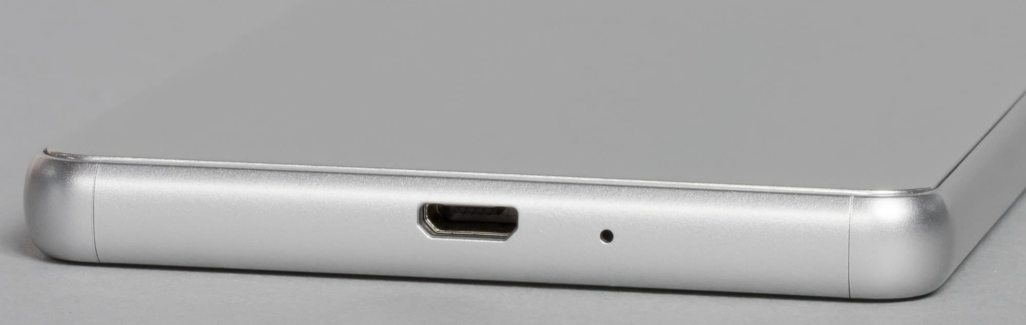 Разъем Micro-USB в нижнем торце выглядит одиноко без привычных решеток динамиков, которые часто красуются на этом месте в смартфонах других производителей. Здесь же с ним соседствует лишь отверстие разговорного микрофона. Разъем Micro-USB поддерживает подключение сторонних устройств в режиме USB OTG (USB Host).