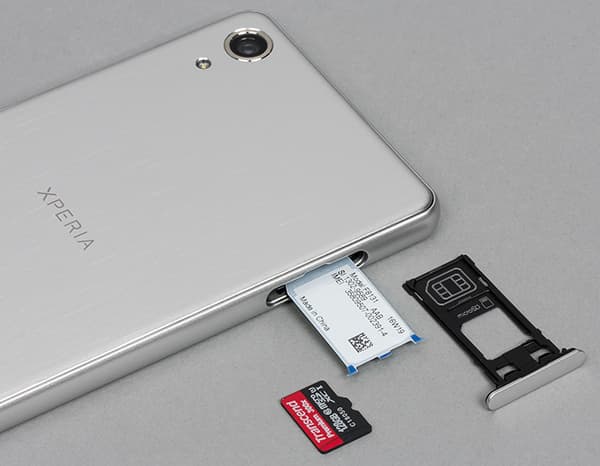 Разъем для карточек расположен сбоку, он прикрыт крышкой, скрепленной с самим выдвигающимся подносом. Теперь Sony тоже применяет в своих двухсимочных смартфонах гибридный слот, где приходится выбирать между двумя SIM-картами и картой памяти вместо одной из них. В односимочной же версии слот для карточек тоже один, и на выдвигающийся поднос тоже можно уложить две карточки, но там не предусмотрен вариант установки второй SIM-карты вместо microSD. Кстати, эти модификации различаются и объемом встроенной флэш-памяти, у младшей ее 32 ГБ против 64 ГБ у варианта с двумя SIM-картами. У нас на тесте был односимочный аппарат, у которого имеется 32 ГБ собственной памяти и можно установить карту microSD объемом до 200 ГБ.