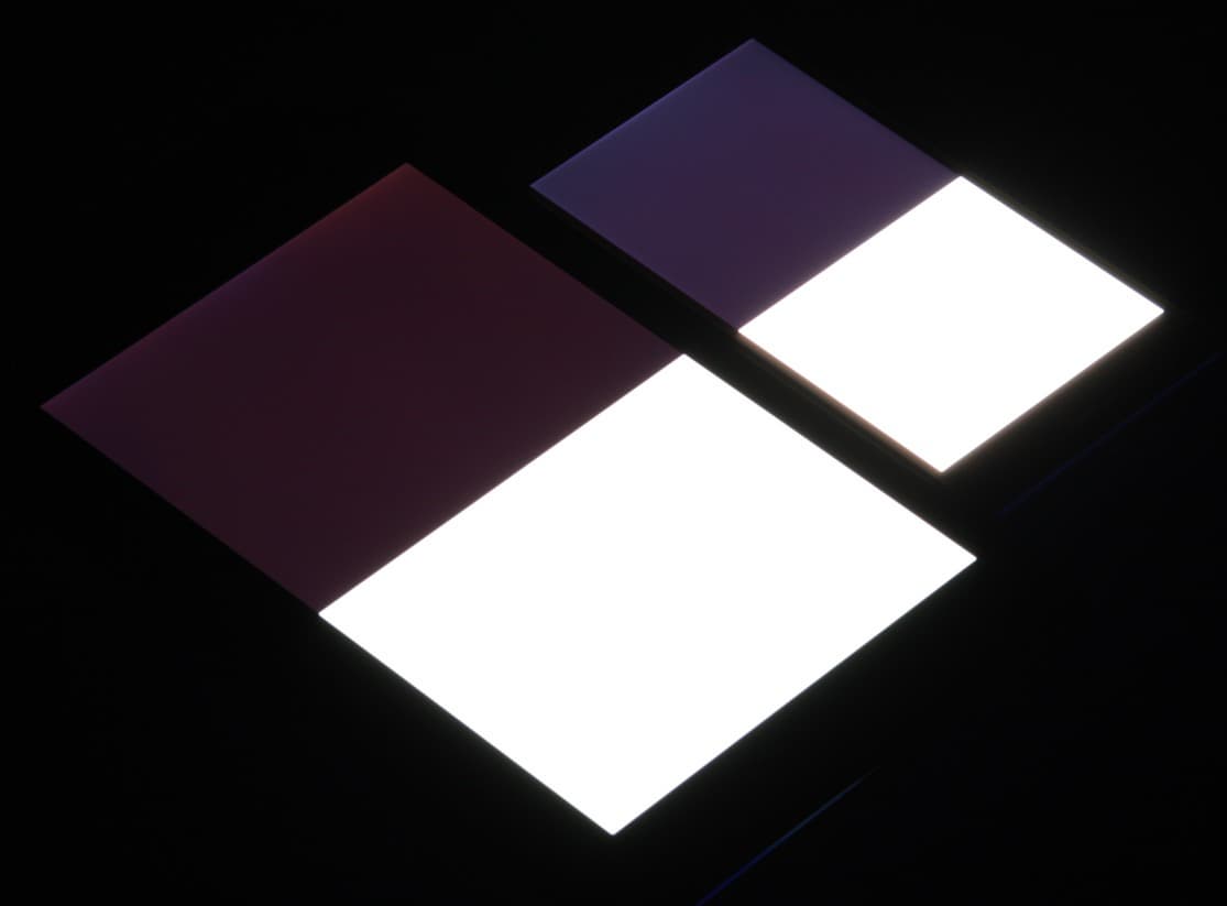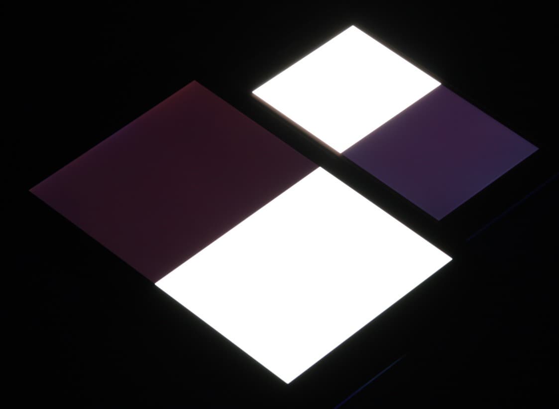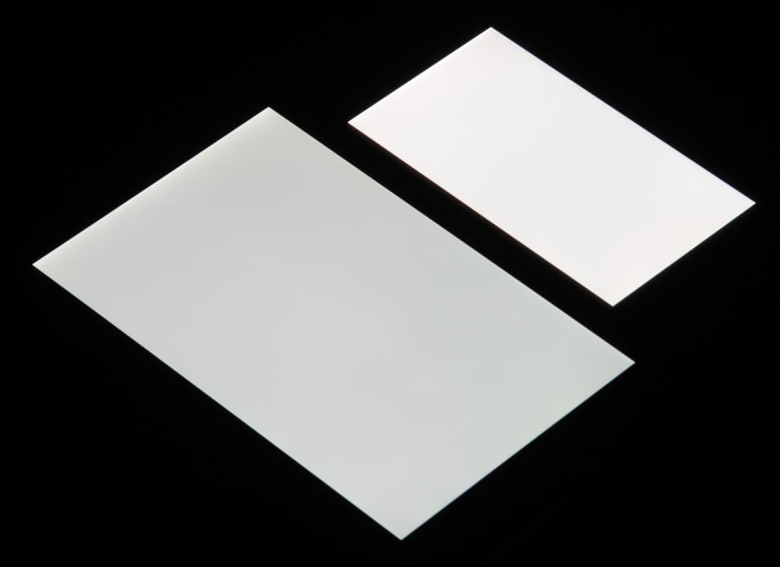 Яркость под углом у обоих экранов заметно уменьшилась, но в случае Sony Xperia X падение яркости гораздо меньше. Черное поле при отклонении по диагонали высветляется в средней степени и приобретает красно-фиолетовый оттенок. Фотографии ниже это демонстрируют (яркость белых участков в перпендикулярном плоскости экранов направлении у экранов одинаковая!):
