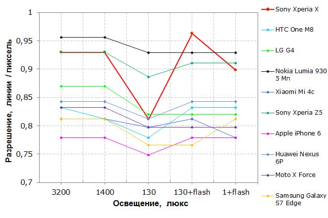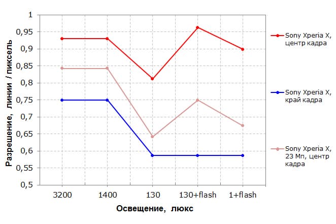 Сразу можно заключить, что по сравнению с моделями предшественников камера практически не выросла. Ничего страшного в этом нет, потому что предыдущая камера была очень хороша. Но и былые недостатки никуда не делись. Несмотря на то, что Sony уже давно позиционируют свою камеру как 23-мегапиксельную, она по-прежнему адекватно работает только в режиме 8 Мп. Здесь положительно сказываются и хорошие алгоритмы группировки/сжатия, и чуть меньшая полезная площадь сенсора. Видимо, сенсор таких размеров полностью отработать при столь малом расстоянии до объектива мешает элементарная геометрия, поэтому полученную картинку приходится растягивать за углы, чтобы заполнить необходимый прямоугольник. Как следствие, чудовищная дисторсия «размазывается» по всем углам, а программа усиленно пытается это скрыть, и в итоге углы кадра на полноразмерных снимках абсолютно нерабочие — настолько, что мы отказались от идеи приводить значения разрешения в них на графике. При этом разрешение в центре достаточно неплохое, а в случае 8 Мп — и вовсе отличное. К тому же, при пересчете снимков в 8 Мп уходит множество дефектов, включая шумы. Таким образом, если рассматривать камеру как 8-мегапиксельную, можно заключить, что она отлично справится со множеством различных сценариев. К режиму 23 Мп стоит прибегать только в случае крайней необходимости, если требуется запечатлеть какие-то документальные детали в центральной части кадра.