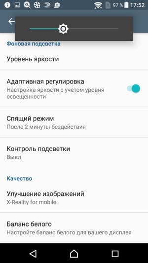 При ручном управлении яркостью и при выводе белого поля во весь экран ее максимальное значение составило порядка 570 кд/м², а минимальное — 5,3 кд/м². Максимальное значение очень высокое, и, учитывая отличные антибликовые свойства, при ярком дневном свете и даже на прямом солнце изображение на экране должно быть хорошо различимым. В полной темноте яркость можно понизить до комфортного уровня. Работает автоматическая регулировка яркости по датчику освещенности (он расположен правее прорези фронтального громкоговорителя). В автоматическом режиме при изменении внешних условий освещенности яркость экрана как повышается, так и понижается. Работа этой функции зависит от положения регулировки яркости, им пользователь может попытаться выставить желаемый уровень яркости в текущих условиях. Если в условиях офиса ползунок яркости вывести на максимум, то в полной темноте функция автояркости уменьшает яркость до 4,8 кд/м² (темновато), в условиях освещенного искусственным светом офиса (примерно 400 лк) устанавливает на 550 кд/м² (чрезмерно ярко), в очень ярком окружении (соответствует освещению ясным днем вне помещения, но без прямого солнечного света — 20000 лк или немного больше) повышает до 560 кд/м² (этого достаточно). Если все также в условиях офиса ползунок яркости на половине шкалы, то яркость экрана для трех условий, указанных выше, следующая: 4,8, 240 и 560 кд/м² (первое значение низковато, второе — высоковато). Если регулятор яркости установлен на минимум — 4,8, 4,8, 60 кд/м² (все значения слишком низкие). Наши попытки добиться от этой функции устраивающего нас результата не увенчались успехом, даже если в темноте чуть повысить яркость до приемлемого уровня, то потом она все равно сбрасывается вниз, и экран становится слишком темным. Но, вероятно, у других пользователей будет другое мнение. Только на очень низком уровне яркости появляется значимая модуляции подсветки, но ее частота высокая, порядка 2,3 кГц, поэтому видимое мерцание экрана отсутствует (но, возможно, может быть выявлено в тесте на наличие стробоскопического эффекта).