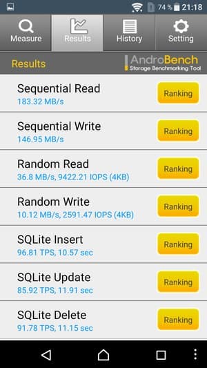 Результаты теста AndroBench на скорость работы с памятью: