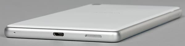 Основной динамик выведен в нижний торец, где прикрывающая его решетка соседствует с разъемом Micro-USB и разговорным микрофоном. Разъем Micro-USB поддерживает спецификации USB 2.0 и подключение внешних устройств в режиме USB OTG (USB Host).