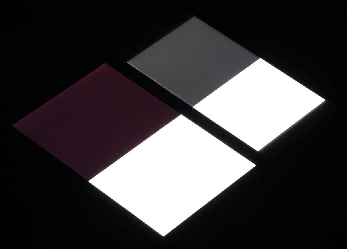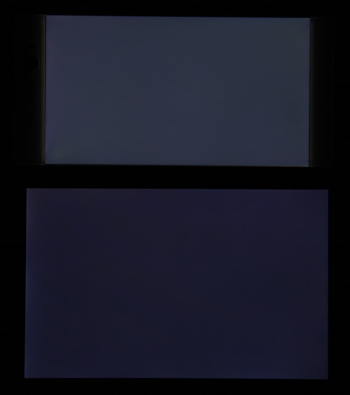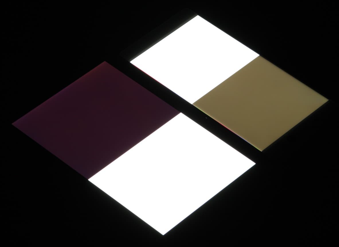 Яркость под углом у обоих экранов заметно уменьшилась, но в случае Sony Xperia XA Ultra падение яркости гораздо меньше. Черное поле при отклонении по диагонали высветляется сильно и приобретает желтоватый оттенок или остается примерно нейтрально-серым. Фотографии ниже это демонстрируют (яркость белых участков в перпендикулярном плоскости экранов направлении у экранов одинаковая!):