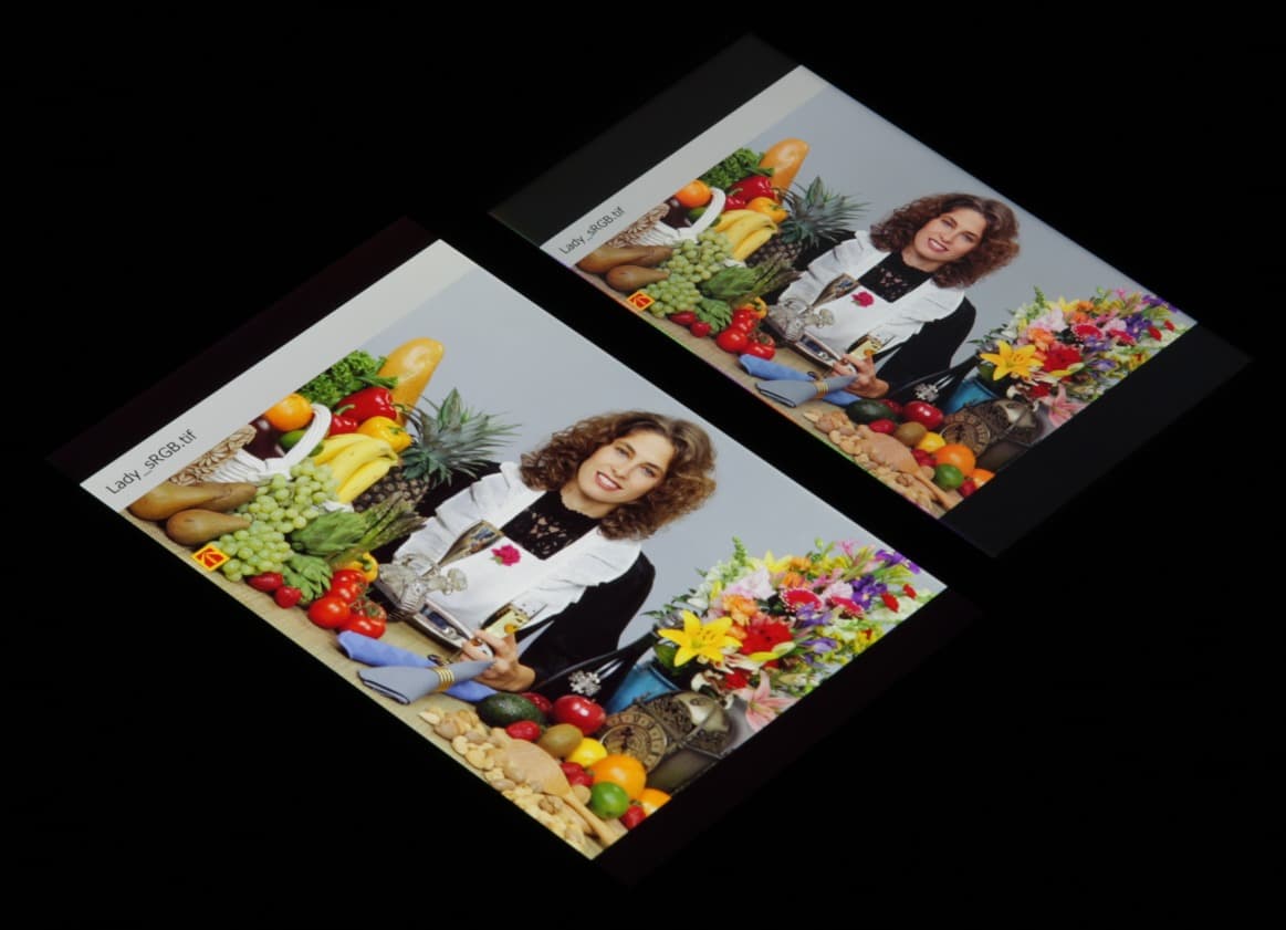 Они очень нетипичные для топовых мобильных устройств Sony. По всей видимости, в этом экране используются светодиоды с синим излучателем и зеленым и красным люминофором (обычно — синий излучатель и желтый люминофор), что в сочетании со специальными светофильтрами матрицы и позволяет получить широкий цветовой охват. Да, и в красном люминофоре, видимо, используются так называемые квантовые точки. К сожалению, в итоге цвета изображений — рисунков, фотографий и фильмов, — ориентированных на пространство sRGB (а таких подавляющее большинство), имеют неестественную насыщенность. Особенно это заметно на узнаваемых оттенках, например на оттенках кожи. Эффект усугубляется тем, что красный цвет сдвинут в синюю область. Результат приведен на фотографии выше.