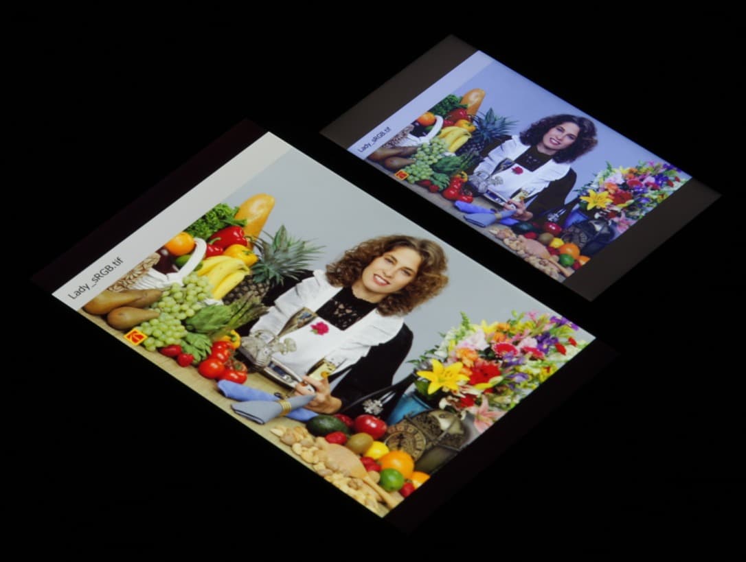 Цвета насыщенные у обоих экранов, цветовой баланс заметно различается. Теперь под углом примерно 45 градусов к плоскости и к стороне экрана: