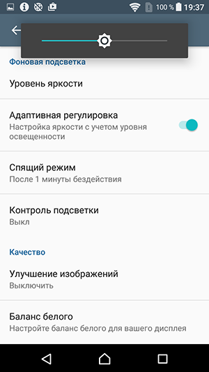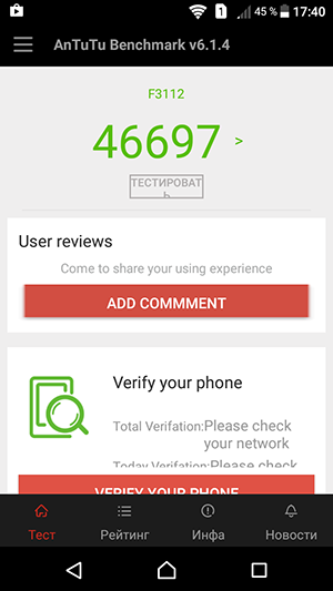 Яркость дисплея имеет автоматическую регулировку на основе датчика освещения. Есть и датчик приближения, который блокирует экран при поднесении смартфона к уху. Технология мультитач позволяет обрабатывать 10 одновременных прикосновений — правда, стандартный тест AnTuTu не смог адекватно справиться с данным экраном. Поддержки работы с экраном в перчатках, в отличие от Xperia X, у рассматриваемого смартфона нет. И уж конечно ушла в прошлое функция работы с мокрыми пальцами, поскольку новые смартфоны Sony не защищены от воды.