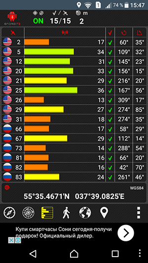 Навигационный модуль работает с GPS (А-GPS) и Глонасс без поддержки китайской Beidou. К скорости работы навигационного модуля претензий нет, первые спутники обнаруживаются при холодном старте в течение первых секунд. Смартфон оборудован сенсором магнитного поля, на основе которого функционирует компас навигационных программ.