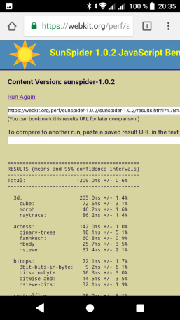 Что касается бенчмарков для оценки скорости движка javascript, то стоит всегда делать скидку на то, что в них результаты существенно зависят от браузера, в котором запускаются, так что сравнение может быть истинно корректным только на одинаковых ОС и браузерах, а такая возможность имеется при тестировании не всегда. В случае с ОС Android мы всегда стараемся использовать Google Chrome.