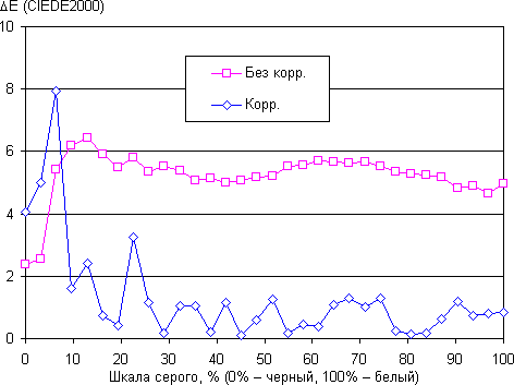 Что мы и попытались сделать; результат — данные, подписанные как Корр. на графиках выше, при ползунках, сдвинутых, как на снимке выше. В итоге мы скорректировали цветовую температуру в нужном направлении и существенно уменьшили ΔE. При этом максимальная яркость снизилась всего до 500 кд/м², то есть запас еще остался. Есть смысл выполнять такую коррекцию.