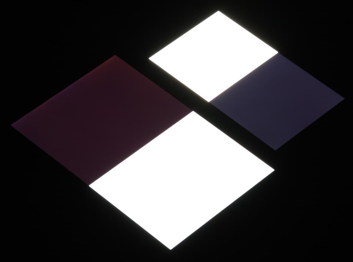 Яркость под углом у обоих экранов заметно уменьшилась (как минимум в 5 раз, исходя из разницы в выдержке), но в случае Sony Xperia XZ Premium падение яркости чуть меньше (яркость по фотографиям 232 против 226 у Nexus 7). Черное поле при отклонении по диагонали высветляется не очень сильно и приобретает фиолетовый оттенок. Фотографии ниже это демонстрируют (яркость белых участков в перпендикулярном плоскости экранов направлении у экранов одинаковая!):