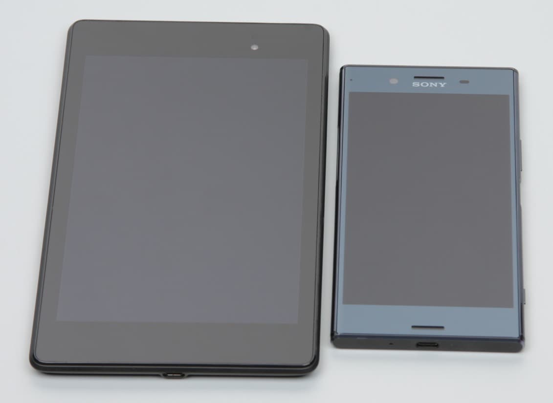 Лицевая поверхность экрана выполнена в виде стеклянной пластины с зеркально-гладкой поверхностью, устойчивой к появлению царапин. Судя по отражению объектов, антибликовые свойства экрана чуть лучше, чем у экрана Google Nexus 7 (2013) (далее просто Nexus 7). Для наглядности приведем фотографию, на которой в выключенных экранах обоих устройств отражается белая поверхность (Sony Xperia XZ Premium, как нетрудно определить, — справа, далее их можно различать по размеру):