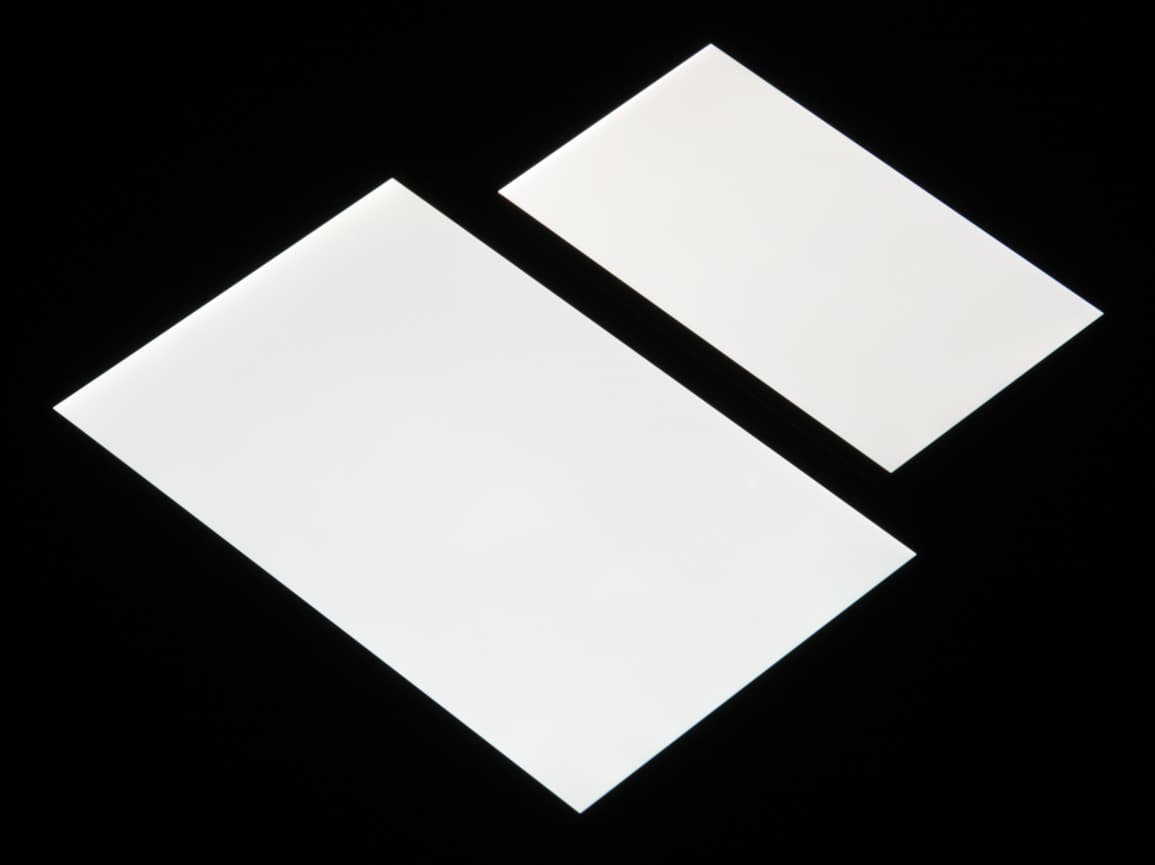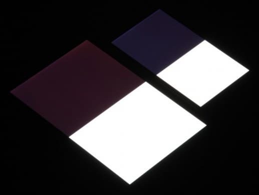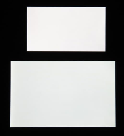 Яркость под углом у обоих экранов заметно уменьшилась, но в случае Sony Xperia XZ1 падение яркости чуть-чуть больше. Черное поле при отклонении по диагонали высветляется слабо (как и у Nexus 7) и приобретает фиолетовый оттенок. Фотографии ниже это демонстрируют (яркость белых участков в перпендикулярном плоскости экранов направлении у экранов одинаковая!):