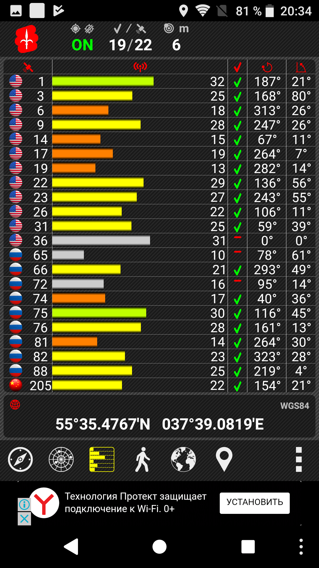 Навигационный модуль работает с GPS (с A-GPS), с отечественной Глонасс и с китайской Beidou. Первые спутники при холодном старте обнаруживаются в течение полуминуты, точность позиционирования удовлетворительная. Имеется встроенный датчик магнитного поля для функционирования компаса.
