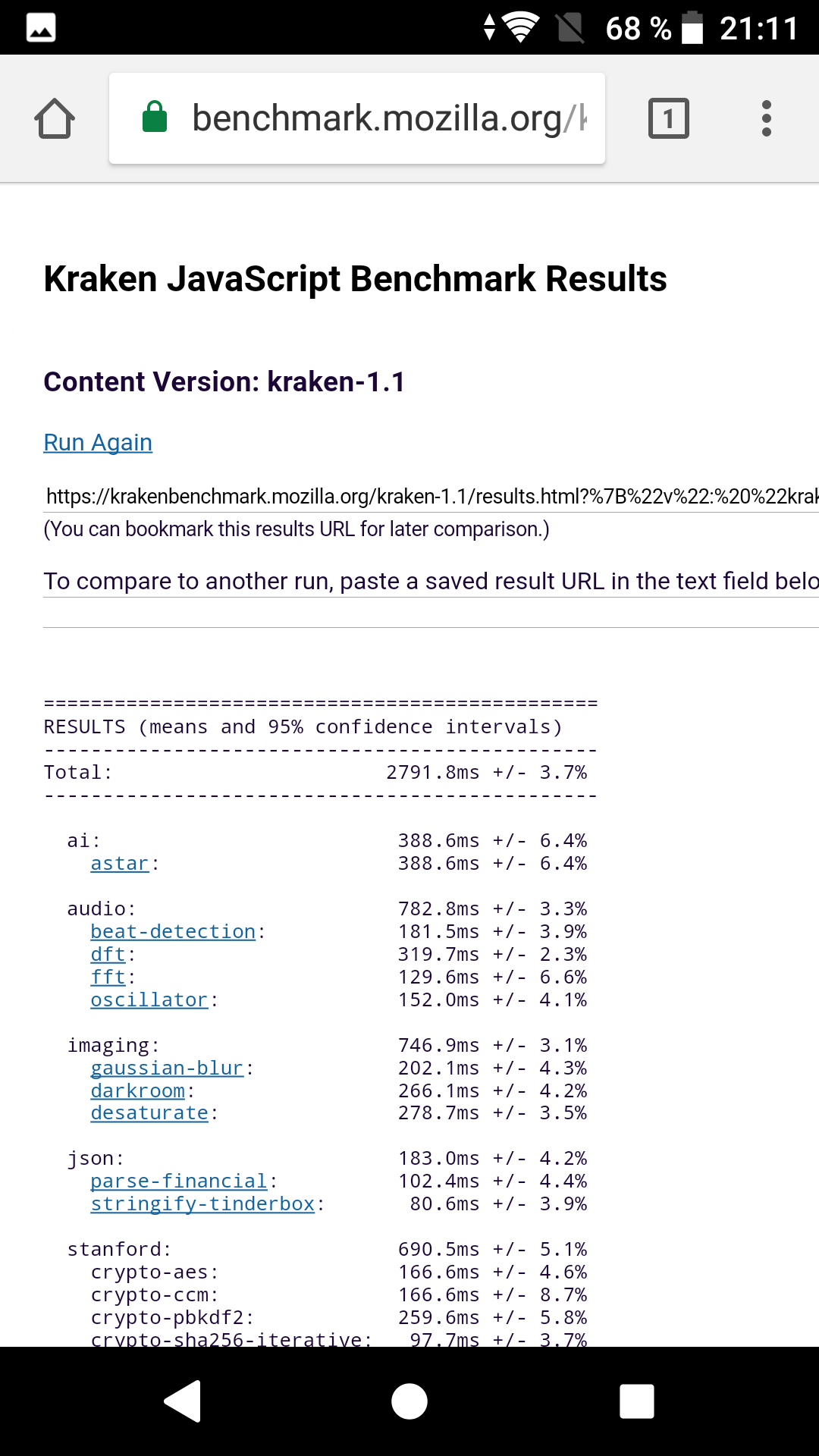 | Mozilla Kraken (мс, меньше — лучше) | 2792 | 2535 | 2494 | 3139 | 13047 |