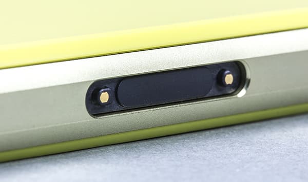 На левой боковой грани расположена открытая контактная группа для соединения с разъемом док-станции — такой элемент встречается у многих современных смартфонов Sony. Такой вариант ежедневной подзарядки телефона удобен для тех, кто не желает каждый день открывать-закрывать крышку разъема Micro-USB. Правда, подставку придется докупать отдельно — док-станция DK32 в штатную комплектацию устройства не входит.
