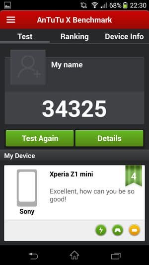 | Sony Xperia Z1 Compact (Qualcomm Snapdragon 800) | ZTE nubia Z5 mini (Qualcomm Snapdragon S4 Pro) | Nexus 5 (Qualcomm Snapdragon 800) | LG G2 (Qualcomm Snapdragon 800) | Meizu MX3 (Samsung Exynos 5410 Octa) | Sony Xperia Z1 (Qualcomm Snapdragon 800) | |