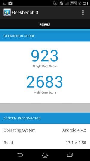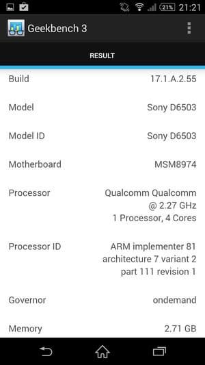 Как и у новых флагманов Samsung и HTC, аппаратная платформа Sony Xperia Z2 строится на базе новейшей однокристальной четырехъядерной системы (SoC) Qualcomm Snapdragon 801 с четырьмя ядрами Krait 400. Напомним, что новая платформа обладает функциональностью Snapdragon 800 с чуть большей частотой процессорных ядер: Snapdragon 801 может работать на частотах до 2,45 ГГц, в то время как частота ядер предыдущей версии чипа была ограничена на уровне 2,36 ГГц. Правда, у Sony Xperia Z2, как и в случае HTC One (M8), максимальная частота процессорных ядер составляет лишь 2,3 ГГц (CPU-Z показывает 2,27 ГГц), что меньше, чем у Samsung Galaxy S5 (2,46 ГГц). Объясняется это тем, что здесь используется немного другая версия Qualcomm Snapdragon 801 (MSM8974AB). В отличие от версии MSM8974AC, которая установлена в Samsung Galaxy S5, здесь максимально возможная частота CPU ограничена 2,36 ГГц, а частота GPU равна 550 МГц (для MSM8974AC эти характеристики составляют 2,45 ГГц и 578 МГц соответственно). Таким образом, из трех самых свежих новинок, представленных на платформе Qualcomm Snapdragon 801 топовыми производителями, лишь аппарат Samsung работает на максимальной версии данной платформы — другие два, Sony Xperia Z2 и HTC One (M8) оснащены чуть менее производительной платформой из новой серии.