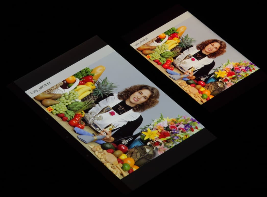 Видно, что цвета не сильно изменились у обоих экранов, и контраст под углом сохранился. И белое поле: