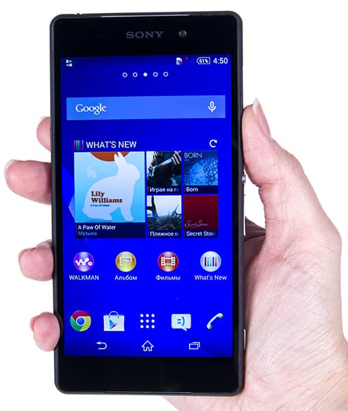 Смартфон ощущается очень большим и тяжелым монолитным бруском, в нем нет той «воздушности», которая чувствуется в пластиковых корпусах Samsung, и нет той гладкой обтекаемости приятного на ощупь металла, что есть у HTC One. В общем, корпус у новой Xperia Z2 достаточно грубый, и с этим ничего уже не поделаешь. Зачем здесь убрали смягчающие контакт с ладонью пластмассовые прокладки между стеклом и металлом — остается загадкой.