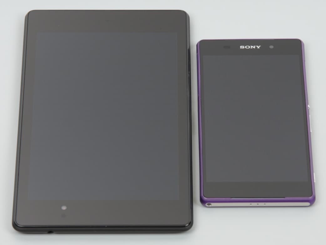 Экран имеет хорошие углы обзора без инвертирования оттенков и без значительного сдвига цветов даже при больших отклонениях взгляда от перпендикуляра к экрану. Для сравнения приведем фотографии, на которой на экраны Nexus 7 и Sony Xperia Z2 выведены одинаковые изображения, при этом яркость обоих экранов установлена примерно на 200 кд/м². Перпендикулярно к плоскости экранов белое поле: