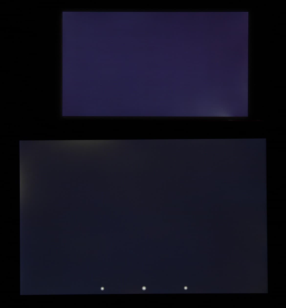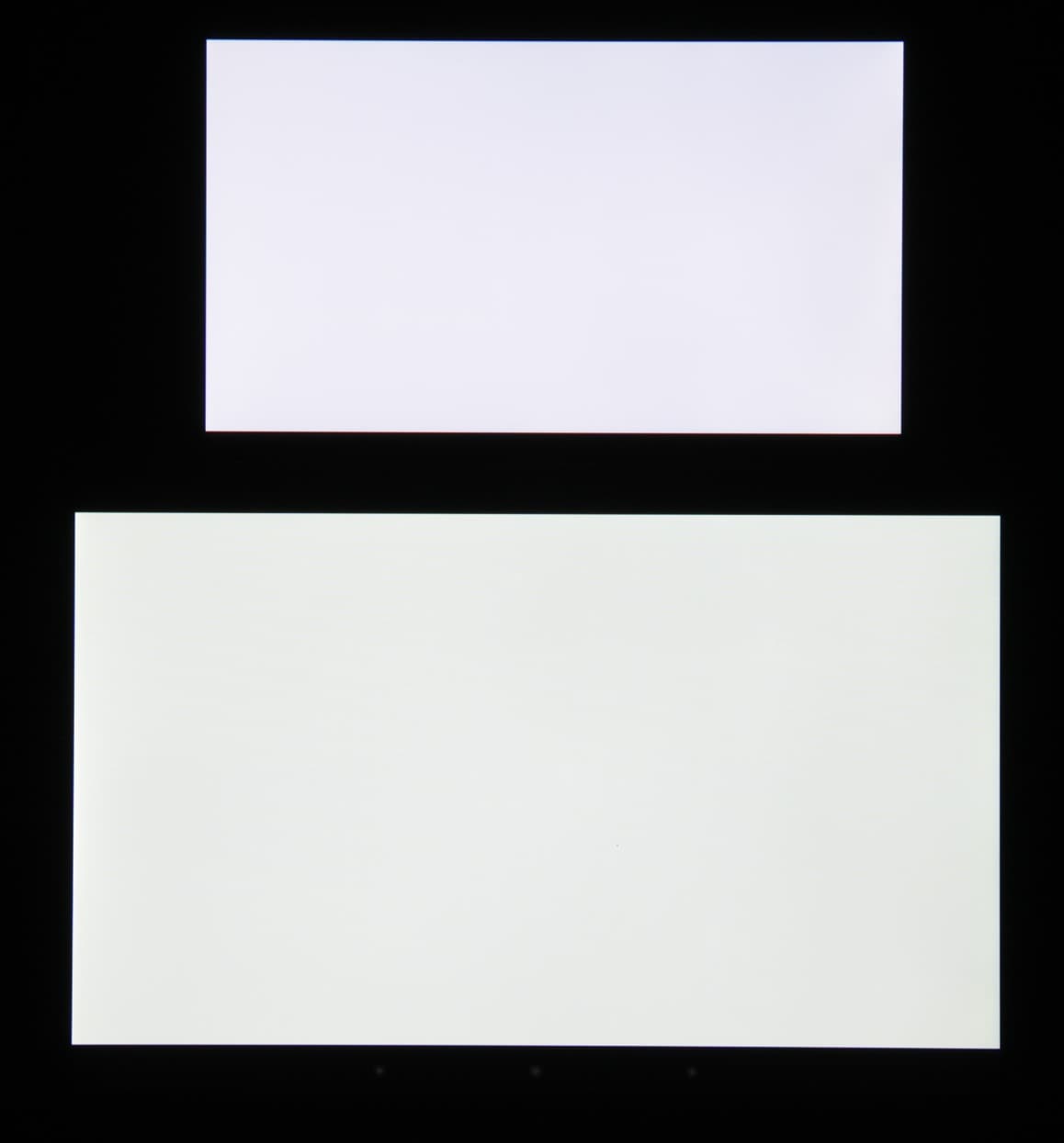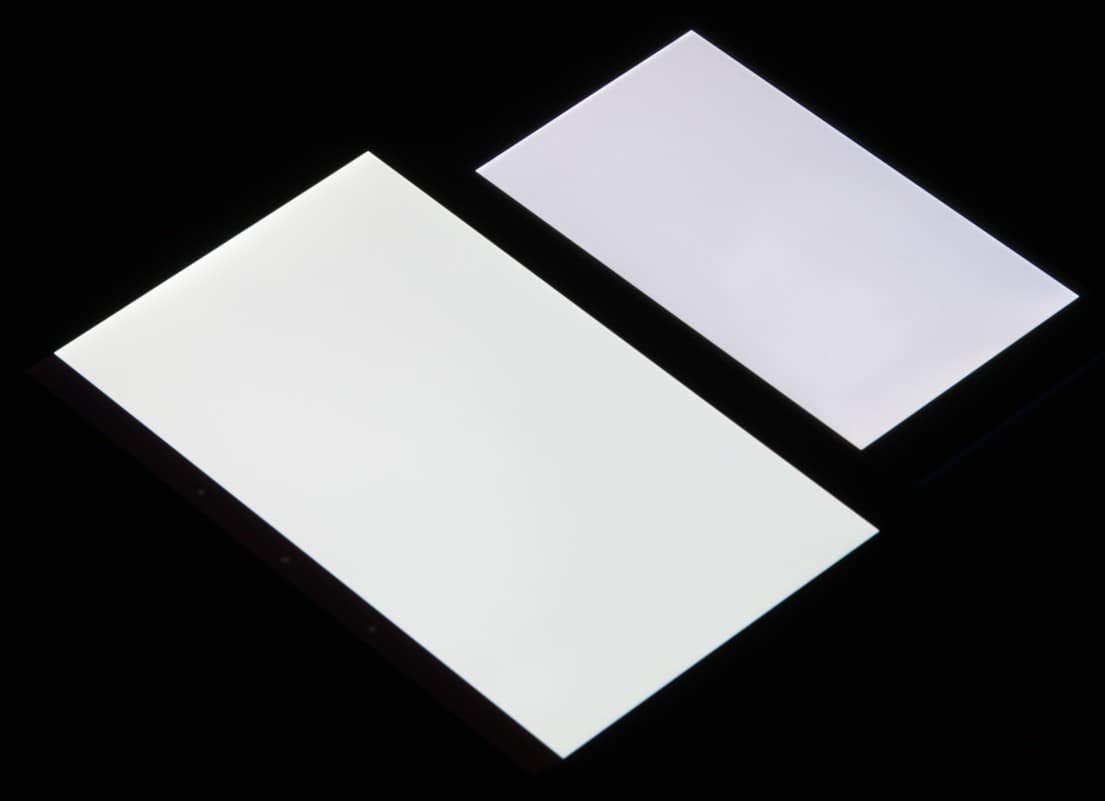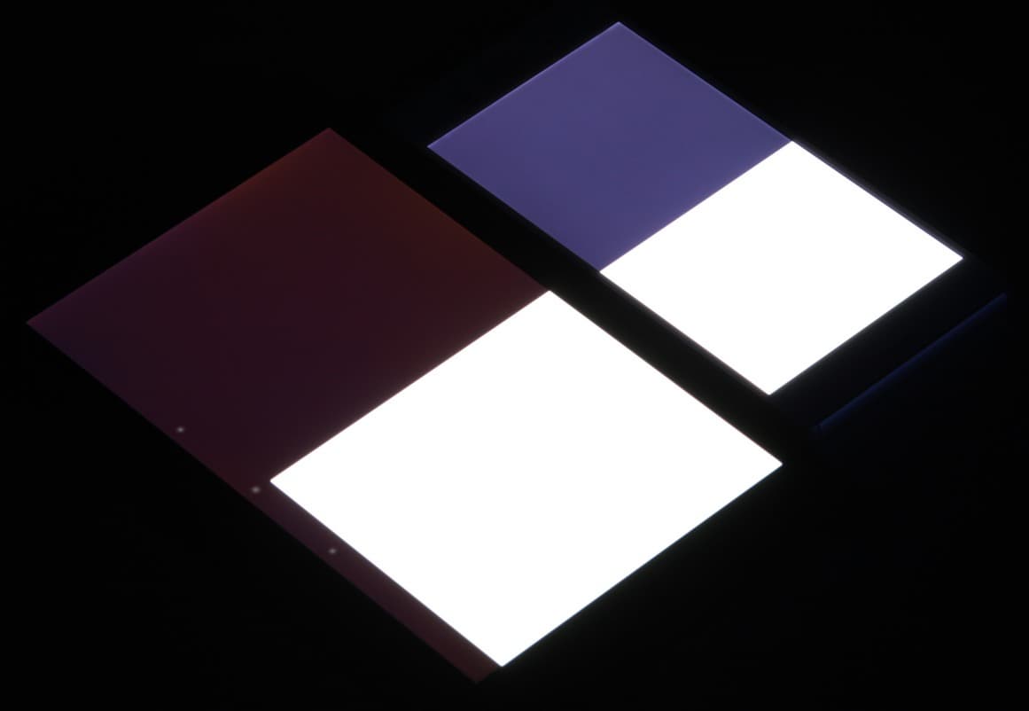 Яркость под углом у обоих экранов заметно уменьшилась (как минимум в 5 раз, исходя из разницы в выдержке), но в случае Sony Xperia Z3 падение яркости больше (яркость по фотографиям 216 против 230 у Nexus 7). При этом цветовой тон изменился несильно. Черное поле при отклонении по диагонали высветляется сильно и приобретает фиолетовый или красно-фиолетовый оттенок. Фотографии ниже это демонстрируют (яркость белых участков в перпендикулярном плоскости экранов направлении у экранов одинаковая!):