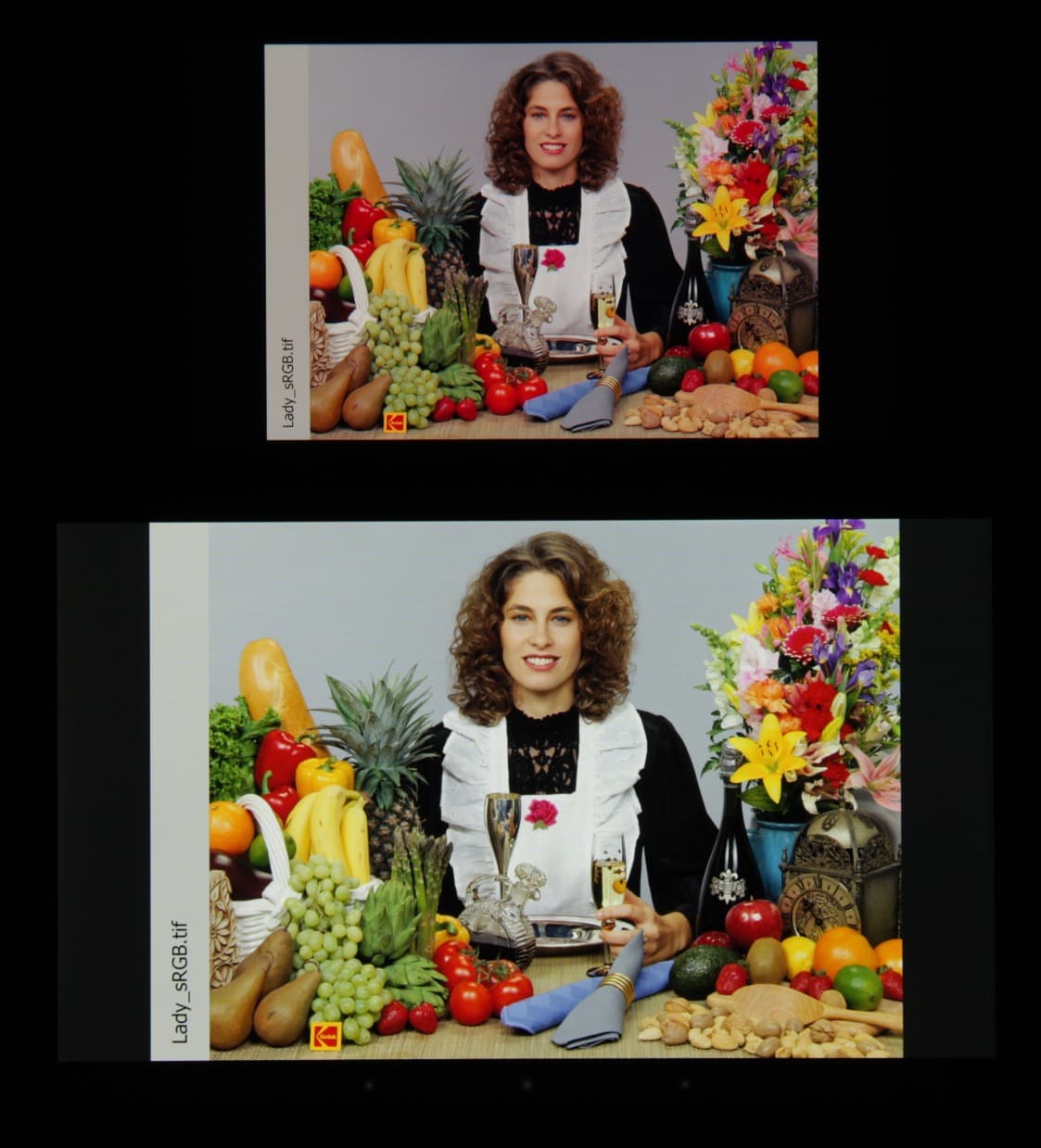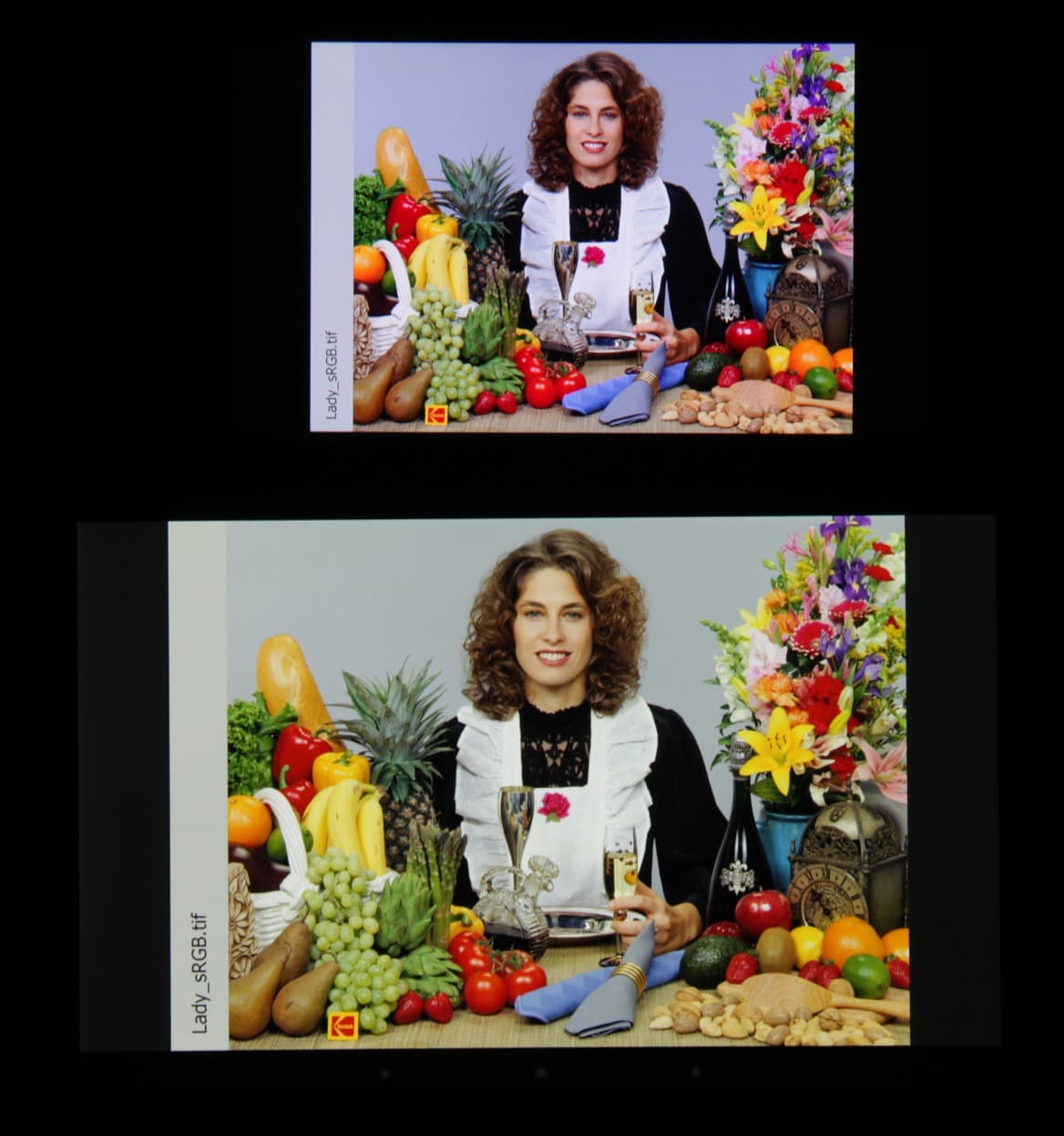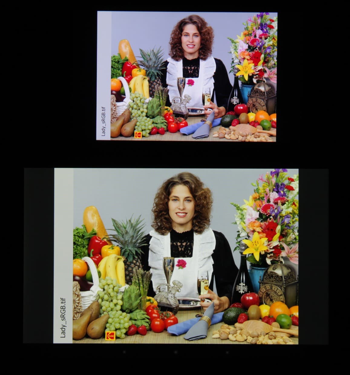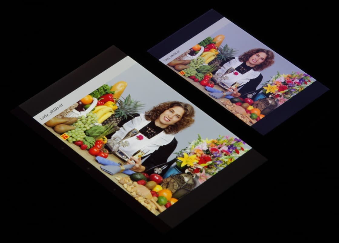 Они очень нетипичные. Как пишут на сайте Sony, в этом экране используются светодиоды с синим излучателем и зеленым и красным люминофором (обычно — синий излучатель и желтый люминофор), что в сочетании со специальными светофильтрами матрицы и позволяет получить широкий цветовой охват. К сожалению, в итоге цвета изображений — рисунков, фотографий и фильмов, — ориентированных на пространство sRGB (а таких подавляющее большинство), имеют неестественную насыщенность. Особенно это заметно на узнаваемых оттенках, например на оттенках кожи. Результат приведен на фотографии выше. Заметим, что при сравнении с Sony Xperia Z2 видно, что производитель попытался улучшить ситуацию с перенасыщенными цветами, и для приведения охвата в норму увеличил перекрестное подмешивание компонент, но что-то его остановило на фазе уменьшения насыщенности зеленого цвета. Спасибо за попытку, но нужно идти дальше, уменьшать до sRGB.