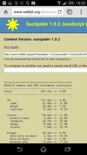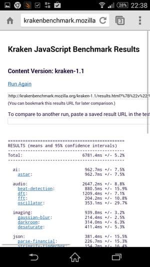 Что касается бенчмарков для оценки скорости движка javascript, то стоит всегда делать скидку на то, что в них результаты существенно зависят от браузера, в котором запускаются, так что сравнение может быть истинно корректным только на одинаковых ОС и браузерах, а такая возможность имеется при тестировании не всегда. В случае с ОС Android мы всегда стараемся использовать Google Chrome.