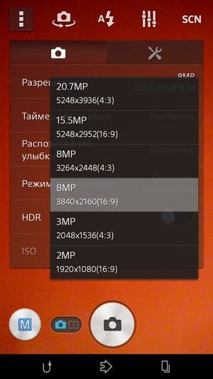 По умолчанию камеры всех аппаратов Sony стандартно работают в так называемом суперавторежиме (iauto) с широкоформатным соотношением сторон кадра, но можно перевести съемку в режим ручных настроек. Примечательно, что при задействовании аппаратной кнопки на боку устройства для быстрого включения камеры она активируется всегда только в режиме автоматической съемки, даже если ранее был включен ручной режим. Если же запускать приложение камеры касанием пиктограммы на дисплее, то в этом случае все проходит как обычно, и камера оставляет нетронутыми предыдущие настройки, то есть запускается в ручном режиме, если таковой был выставлен ранее. Заметим, что между автоматическим и ручным режимами есть большая разница, потому что максимальное разрешение снимков можно выставить только в режиме ручной регулировки. При съемке в автоматическом режиме, который установлен по умолчанию, фотографии получаются размером 3840×2160 (8 Мп), а в ручном режиме максимально возможное разрешение составляет как раз те самые 20,7 Мп (5248×3936).