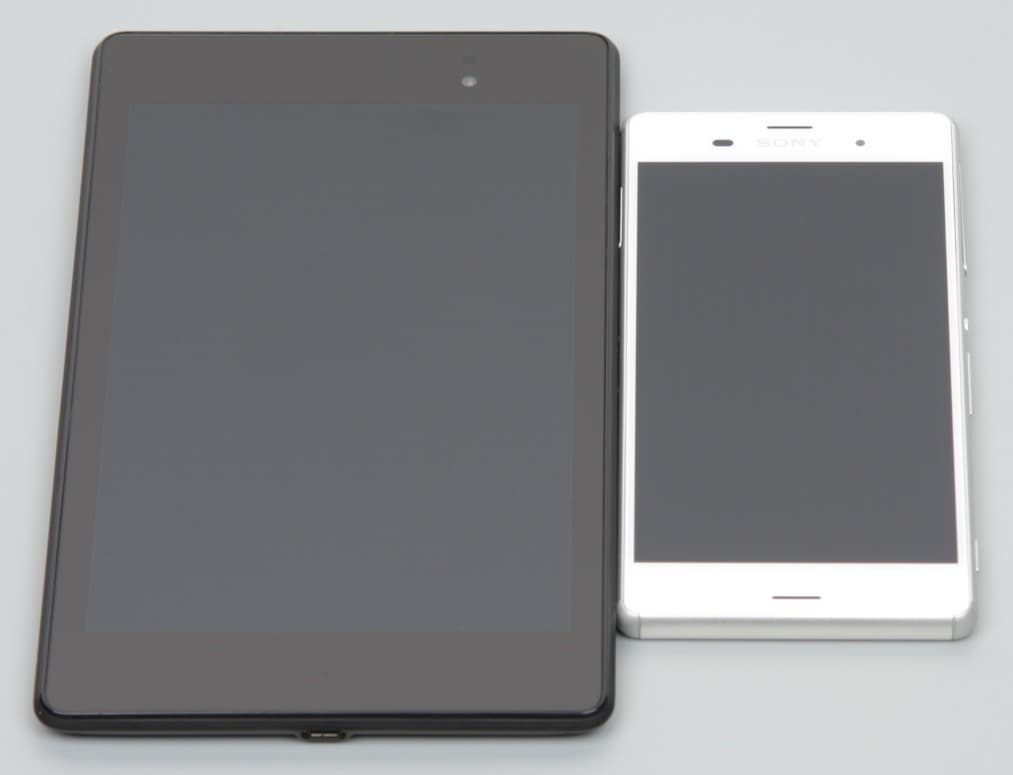 Лицевая поверхность экрана выполнена в виде стеклянной пластины с зеркально-гладкой поверхностью, устойчивой к появлению царапин. Судя по отражению объектов антибликовые свойства экрана не хуже, чем у экрана Google Nexus 7 (2013) (далее просто Nexus 7). Для наглядности приведем фотографию, на которой в выключенных экранах обоих устройств отражается белая поверхность (Sony Xperia Z3, как не трудно определить, — справа, далее их можно различать по размеру):