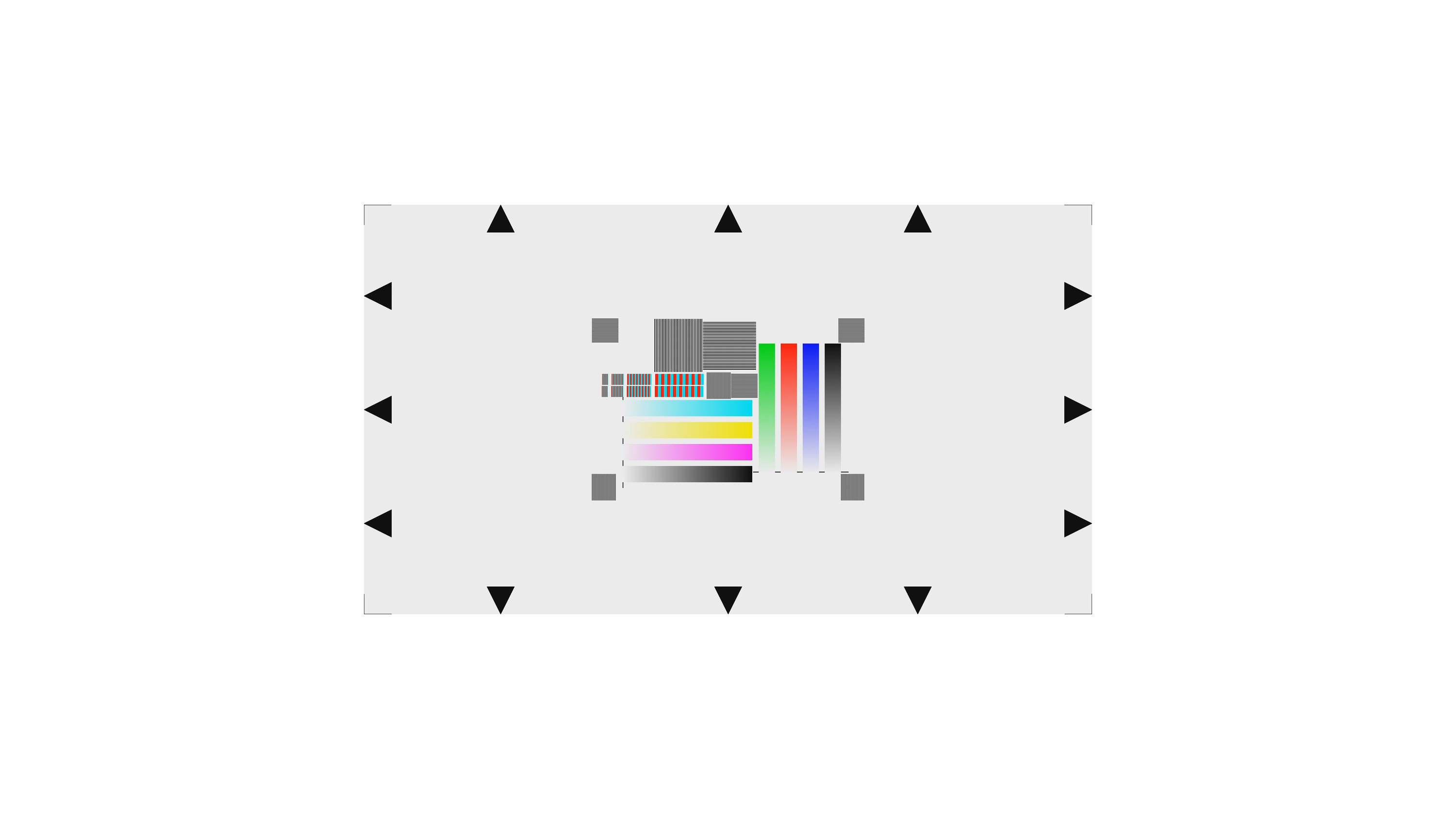Дополнительные тесты показали, что в принципе далеко не каждое приложение вообще способно выводить изображение в этом условном 4К-разрешении. Например, MX Player, FIV, Google Photos осуществляют вывод исключительно в разрешении Full HD, то есть 1920 на 1080 пикселей (до разрешения экрана масштабирует уже сам смартфон), и только демонстратор изображений самой Sony выводит картинку в разрешении 4К (возможно, и штатный видеоплеер Sony тоже умеет это делать). Вот такое ограниченное «4К», не для всех. Хорошо, программу нашли, рассмотрим особенности вывода на примере вертикальной и горизонтальной миры с черными полосками толщиной в один пиксель через белый промежуток тоже в один пиксель. Исходное тестовое изображение доступно по этой ссылке, мира находится в центре. Вот ее фрагмент: