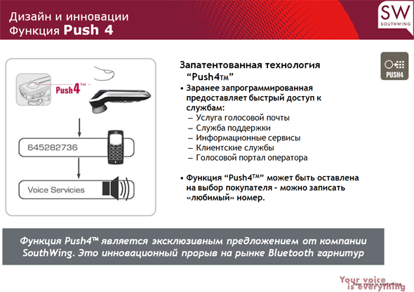 Главным «открытием» инженеров SouthWing является функция Push4. Что она собой представляет? Всего лишь возможность легко и просто позвонить на нужный номер, не доставая телефон и не используя даже голосовой набор. Она может быть настраиваемой покупателем, что имеет достаточно большой смысл — по статистике до 50% звонков абонентов идет всего на один номер (например, муж звонит жене, ребенок — маме, и т.д. и т.п.). Запрограммируем этот номер на Push4 и все — позвонить можно быстро и удобно. Но наиболее популярной стала данная функция у мобильных операторов, совместно с которыми SouthWing осваивал многие рынки (где гарнитуры SouthWing давно доступны под брендами T-Mobile, Telefonica, Vodafone, Orange, AT&T и другими). Причина понятна — если еще до продажи «забить» в гарнитуру номер, например, голосового портала оператора, пользователи будут пользоваться им куда более охотно, чем если бы им пришлось этот номер набирать. Причем это может быть и платный номер — все равно популярность услуги будет большей, чем могла бы без использования новых технологий продвижения. По отзывам операторов, при грамотном использовании Push4 позволяет им повысить уровень дохода с одного абонента в среднем аж на 20% — для крайне конкурентного европейского рынка, вообще-то, это очень много и сравнимо с очень мощными маркетинговыми компаниями. Так что ничего удивительного, что на Западе операторы готовы давать абонентам очень высокие скидки при продаже оборудования — как я уже сказал в начале статьи, основные расходы там приходятся на услуги, так что при таком приросте ARPU даже бесплатно гарнитуры раздавать все равно выгодно ;)