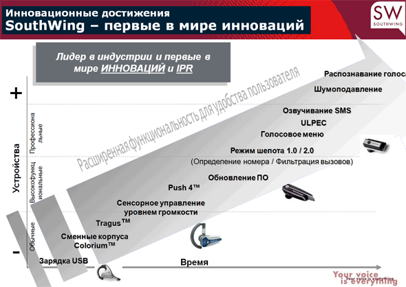 Посмотрим, чем же компания собирается этот самый спрос привлекать. В первую очередь инновациями. На слайде приведены дополнительные функциональные возможности гарнитур SouthWing разных классов. Некоторые из них общие для всего рынка, но есть и эксклюзивные разработки самого производителя, чему придается большое значение – недаром за достаточно небольшой срок существования арсенал компании уже содержит один патент и еще шесть патентов находятся в стадии рассмотрения компетентными органами.
