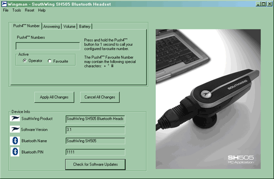 Приложение для работы с гарнитурой называется Wingman. В его задачи входит проверка наличия обновлений firmware и (при обнаружении) их закачка в гарнитуру. Но не только это, а еще и выполнение всяких тонких настроек, которые с самой гарнитуры настраиваются путем кучи нажатий на кнопки или вообще не настраиваются. Например, на первой же закладке легко и непринужденно вводится номер Push4. Причем даже при наличии в гарнитуре прошитого оператором номера, можно не удаляя его записать и свой собственный. А потом вернуться обратно.