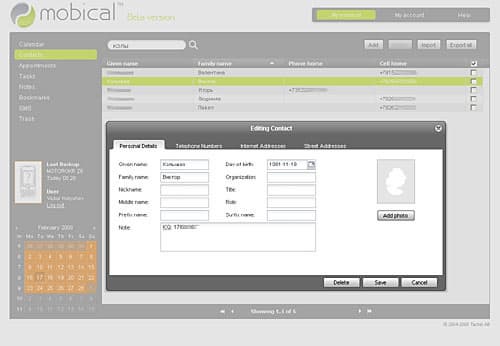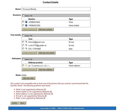 При первом знакомстве, складывается впечатление, что ресурс нацелен на максимальный аскетизм. Ни о каких автоматических настройках телефона речи не идет. Форма предоставления информации ограничивается 2-х колоночными списками, что в наше время не слишком актуально. Подгрузка выбранного объекта занимает некоторое время, о технологии заблаговременного кэширования тут не подумали. А ведь зачастую пользователи подобных служб получают доступ к глобальной паутине из самых разнообразных мест и самым непредсказуемым способом. Зато по части доступных для синхронизации БД тут есть чем похвастаться. Поддерживаются все 4 официальных SyncML профиля: Контакты, Календарь, Задачи и Заметки. С русским языком, также, проблем не возникло. Все замечательно синхронизировалось и распозналось. К существенным недостаткам можно было бы отнести доступ к сайту по незащищенному каналу, но это аргумент скорее для параноика, чем для рядового пользователя. Особенно в свете того, что половина номеров у населения сохранены в виде: Коля Баня, Света школа и т.п. перлы. Этот сервис можно смело рекомендовать минималистам, которым важен результат, а не эстетическое восприятие.