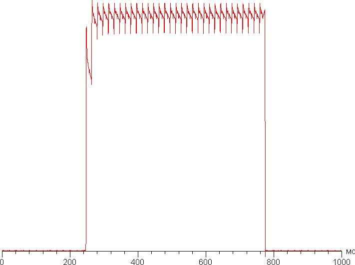Переключение состояния элементов матрицы выполняется практически мгновенно, но на фронте включения (и реже — выключения) может присутствовать ступенька шириной примерно 17 мс. Например, так выглядит зависимость яркости от времени при переходе от черного к белому и обратно: