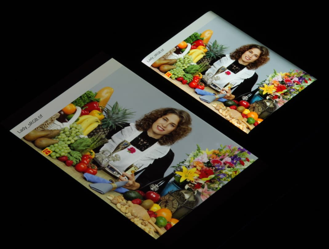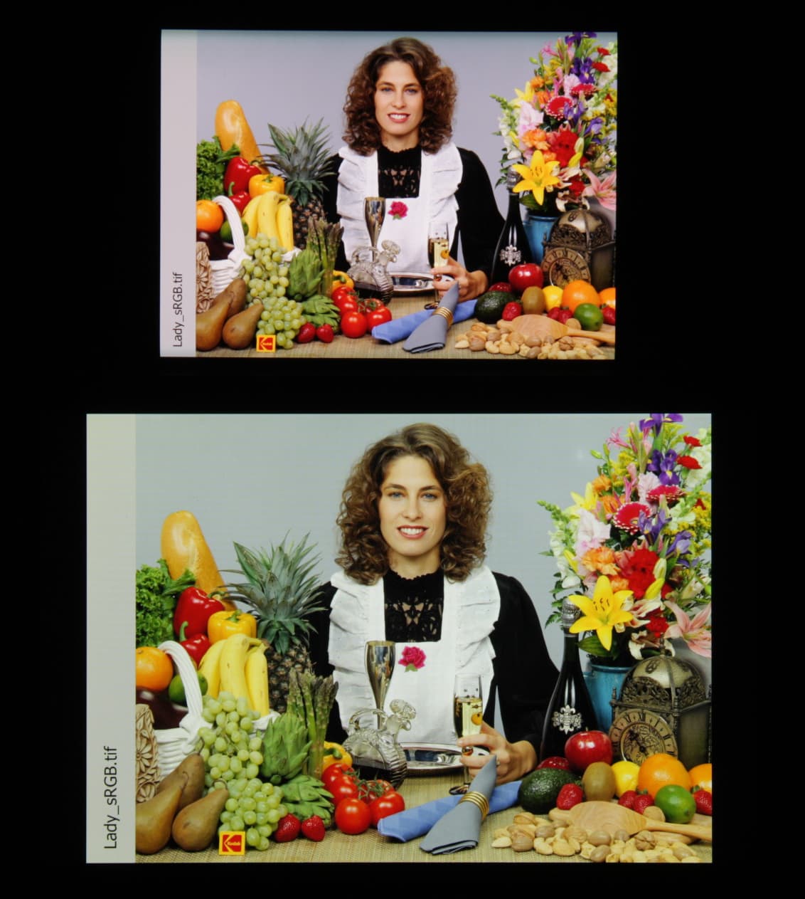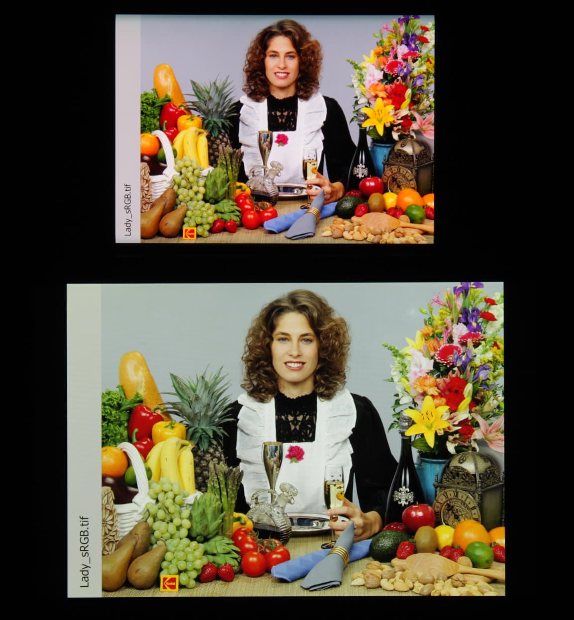 Согласно визуальной оценке, цвета у тестируемого экрана более-менее естественные, а цветовой баланс экранов немного различается. Напомним, что фотография не может служить надежным источником сведений о качестве цветопередачи и приводится только для условной наглядной иллюстрации. В частности, выраженный красноватый оттенок белого и серого полей, присутствующий на фотографиях тестируемого экрана, при перпендикулярном взгляде визуально отсутствует, что подтверждается аппаратными тестами с помощью спектрофотометра. Причина в том, что спектральная чувствительность матрицы фотоаппарата неточно совпадает с этой характеристикой человеческого зрения. Заметим, что в данном случае картинка занимает в высоту (при ландшафтной ориентации экрана) всю доступную для вывода изображения область и заходит на загнутые края экрана, что приводит к легкому затемнению и искажению цвета. Также на свету эти области почти всегда бликуют, что еще больше мешает при просмотре изображений, выведенных на весь экран. И даже картинка фильмов с соотношением сторон 16:9 заходит на загибы, что мешает при просмотре кино.