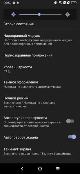 Это типичный китайский интерфейс, который обилием всевозможных настроек способен удовлетворить любой, самый искушенный пользовательский вкус. Поддерживается работа жестами, одной рукой, есть разделение экрана, виртуальная выдвижная боковая панель, игровой режим с блокировкой оповещений в процессе игры и многое другое. При этом, интерфейс чистый, нет замусоренности рекламными предложениями и предустановленными демо-играми. Обязательные по новому российскому закону программы, безусловно, предустановлены, без этого теперь уже никак. Темная тема и официальный магазин приложений Google с сервисами Google — на месте.