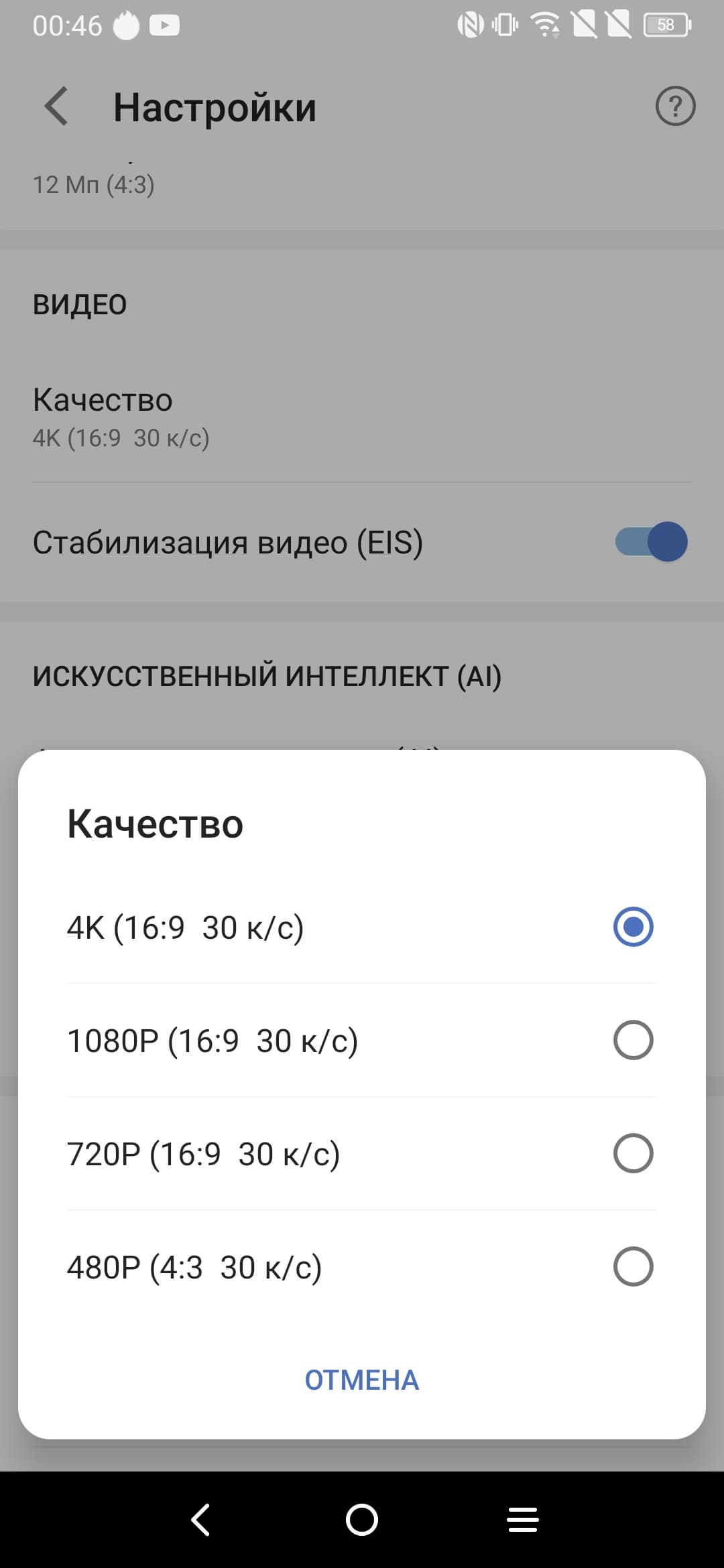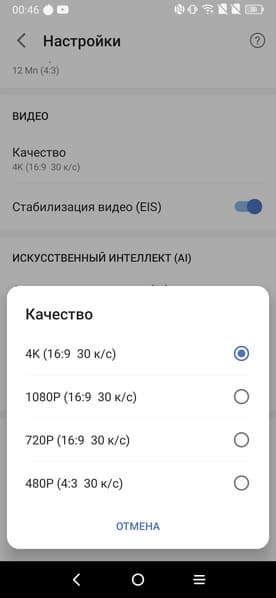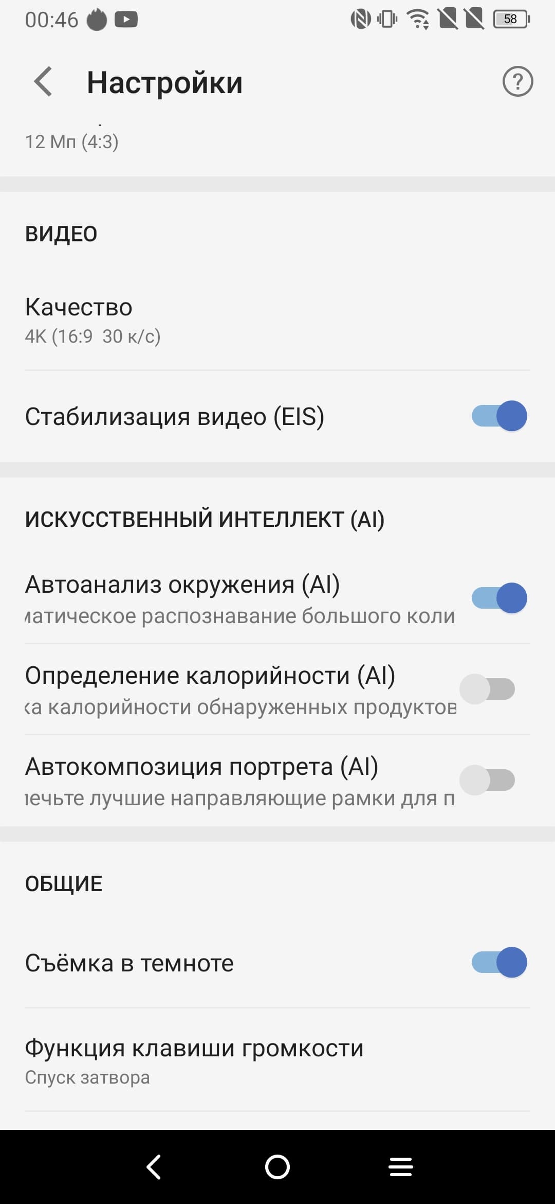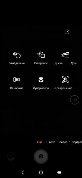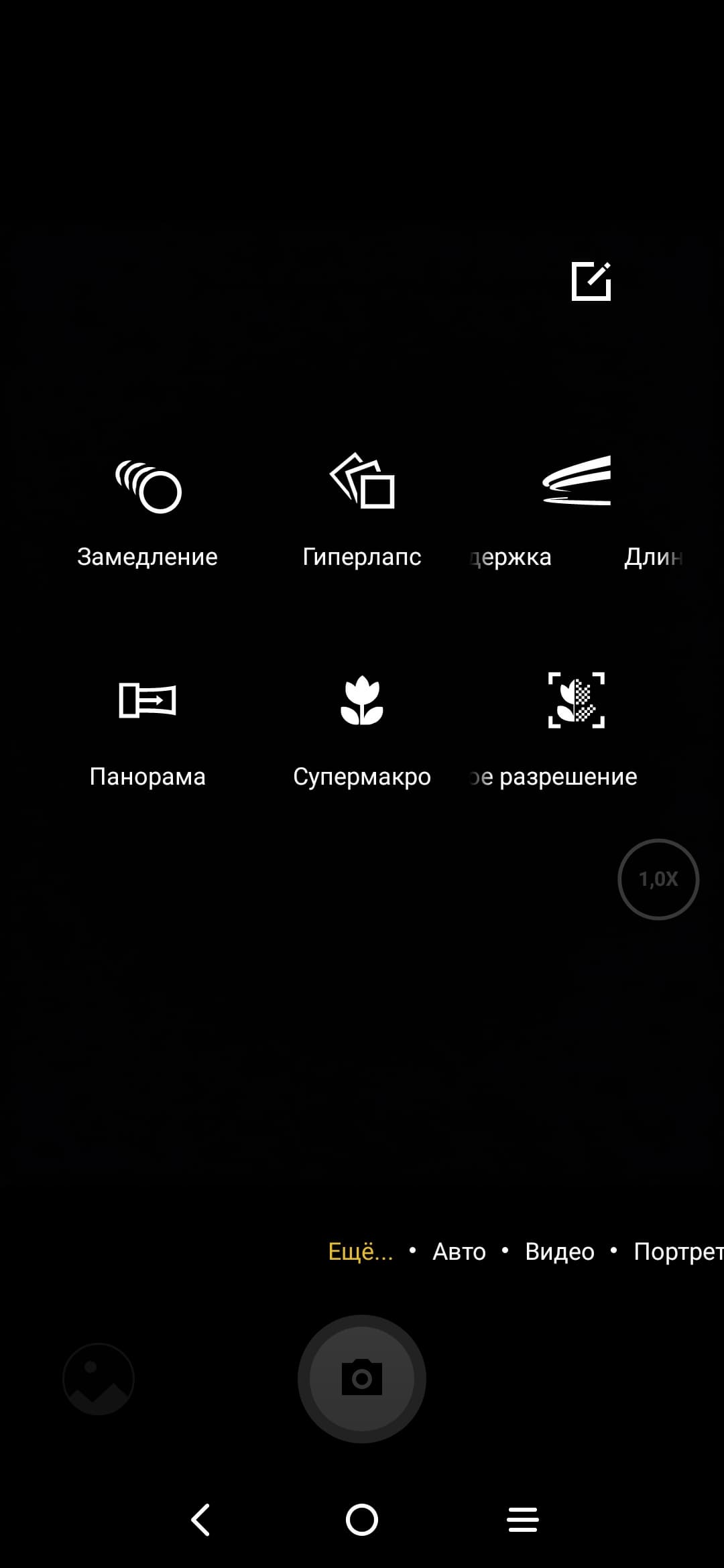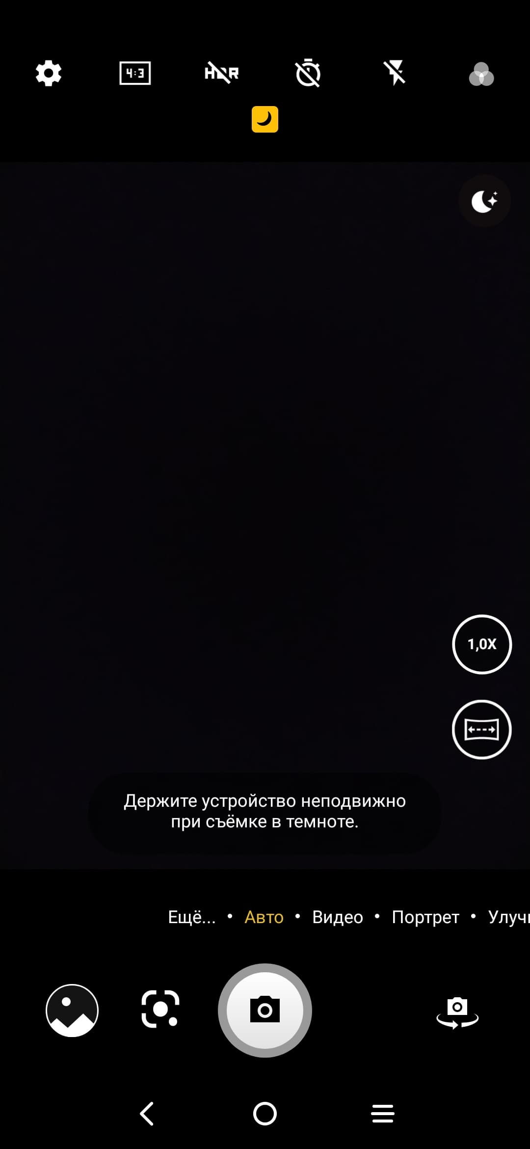 Интерфейс управления съемкой привычный, без отклонений от общепринятых в последнее время стандартов. Все основные режимы прокручиваются в нижней части видоискателя, остальные спрятаны в разделе «Еще». Среди возможностей есть все, что нужно для мобильной съемки: Auto HDR, портретный и ночной режимы, отключаемая электронная стабилизация, возможность съемки с функцией объединения 4 пикселей в один. Нет только возможности сохранять снимки в RAW.