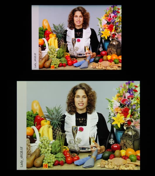 Отметим хорошую равномерность яркости и цветового тона белого поля (за исключением едва видимого затемнения и изменения оттенка к загнутым краям).