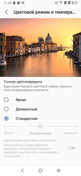 Присутствует функция Адаптация цветовых оттенков, которая, если ее включить, подстраивает цветовой баланс под условия окружающей среды. К примеру, мы ее активировали и поместили смартфон под светодиодные светильники с холодным белым светом (6800 К), получив в итоге значения 0,9 для ΔE и 7360 К для цветовой температуры (по умолчанию — 0,0 и 7160 К). Под галогеновой лампой накаливания (теплый свет — 2800 К) — 2,0 и 5700 К, соответственно. То есть цветовая температура в первом случае чуть повысилась, а во втором стала ниже. Функция работает так, как ожидалось. Отметим, что сейчас сложившимся стандартом является калибровка устройств отображения к точке белого в 6500 К, но в принципе, коррекция под цветовую температуру внешнего света может принести пользу, если хочется добиться лучшего соответствия изображения на экране тому, что видно на бумаге (или на любом носителе, на котором цвета формируются за счет отражения падающего света) в текущих условиях.
