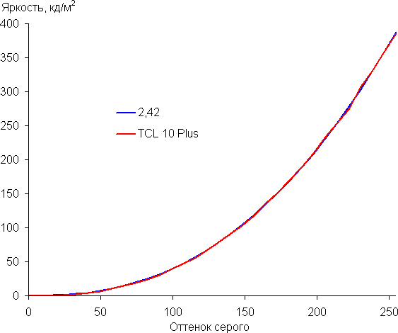 Построенная по 32 точкам с равным интервалом по численному значению оттенка серого гамма-кривая не выявила завала ни в тенях, ни в светах. Показатель аппроксимирующей степенной функции равен 2,42, что выше стандартного значения 2,2, поэтому картинка чуть затемнена. При этом реальная гамма-кривая мало отклоняется от степенной зависимости: