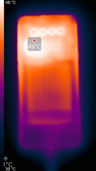 Нагрев больше в верхней части аппарата, что, видимо, соответствует расположению микросхемы SoC. По данным теплокамеры, максимальный нагрев составил 49 градусов (при температуре окружающего воздуха в 24 градуса), это рекордно высокий нагрев в данном тесте в сравнении с другими современными смартфонами.