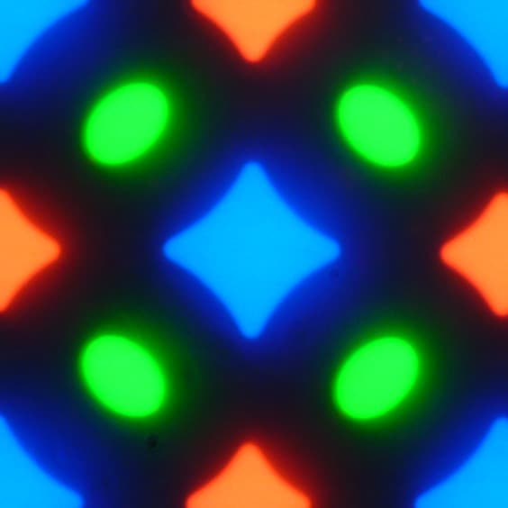 В этом экране используется матрица AMOLED — активная матрица на органических светодиодах. Полноцветное изображение создается с помощью субпикселей трех цветов — красного (R), зеленого (G) и синего (B), но красных и синих субпикселей в два раза меньше, что можно обозначить как RGBG. Это подтверждается фрагментом микрофотографии: