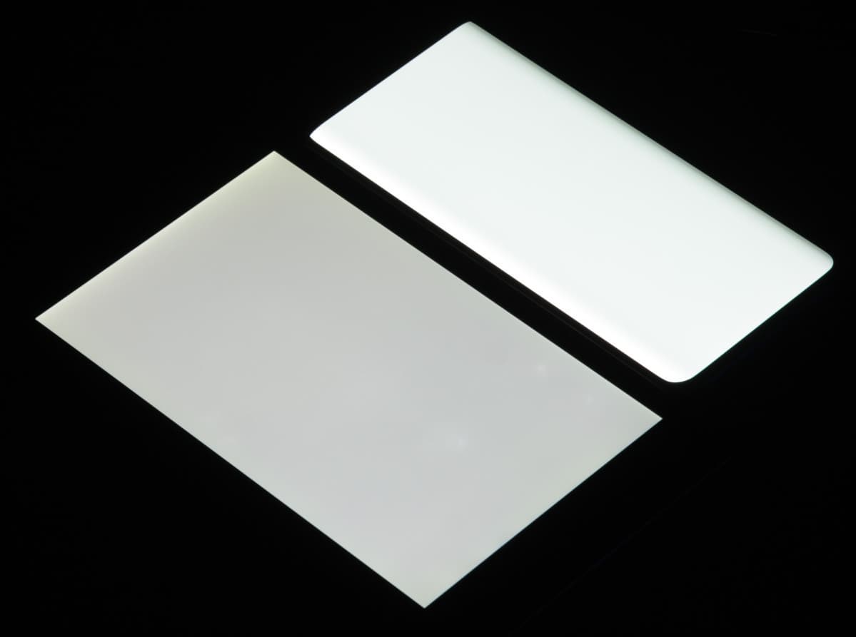 Лицевая поверхность экрана выполнена в виде стеклянной пластины с зеркально-гладкой поверхностью, устойчивой к появлению царапин. Судя по отражению объектов, антибликовые свойства экрана не хуже, чем у экрана Google Nexus 7 (2013) (ниже просто Nexus 7). Для наглядности приведем фотографию, на которой в выключенных экранах отражается белая поверхность (слева — Nexus 7, справа — TCL 10 Plus, далее их можно различать по размеру):