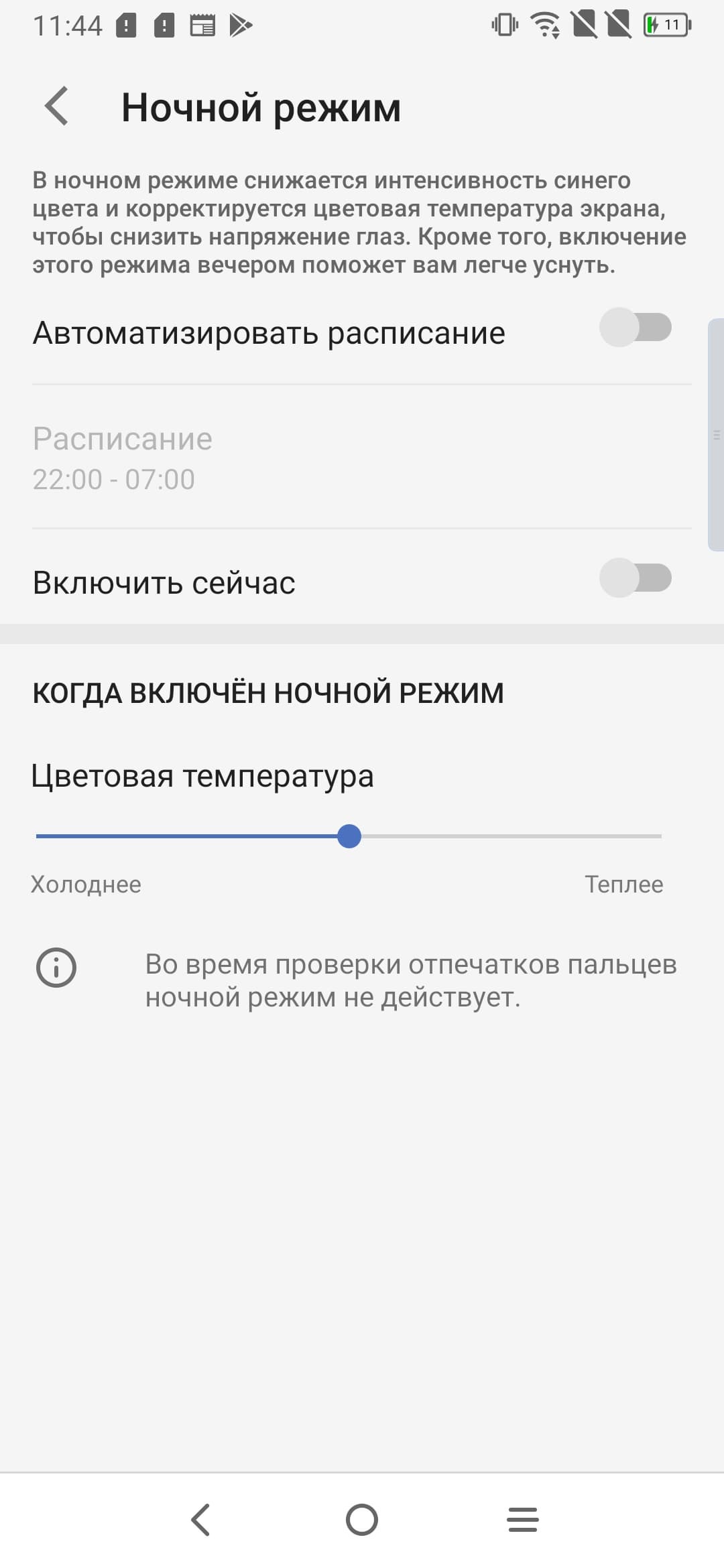 Разумеется, присутствует настройка (Ночной режим), позволяющая снизить интенсивность синей компоненты: