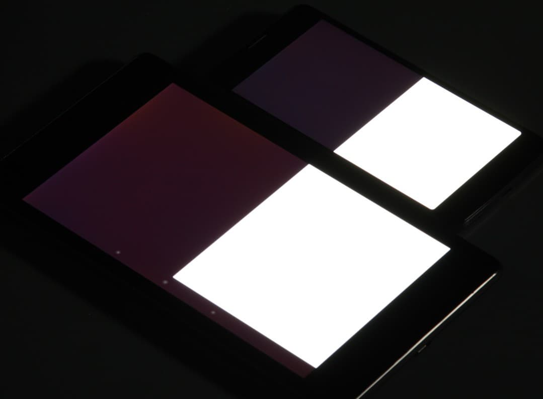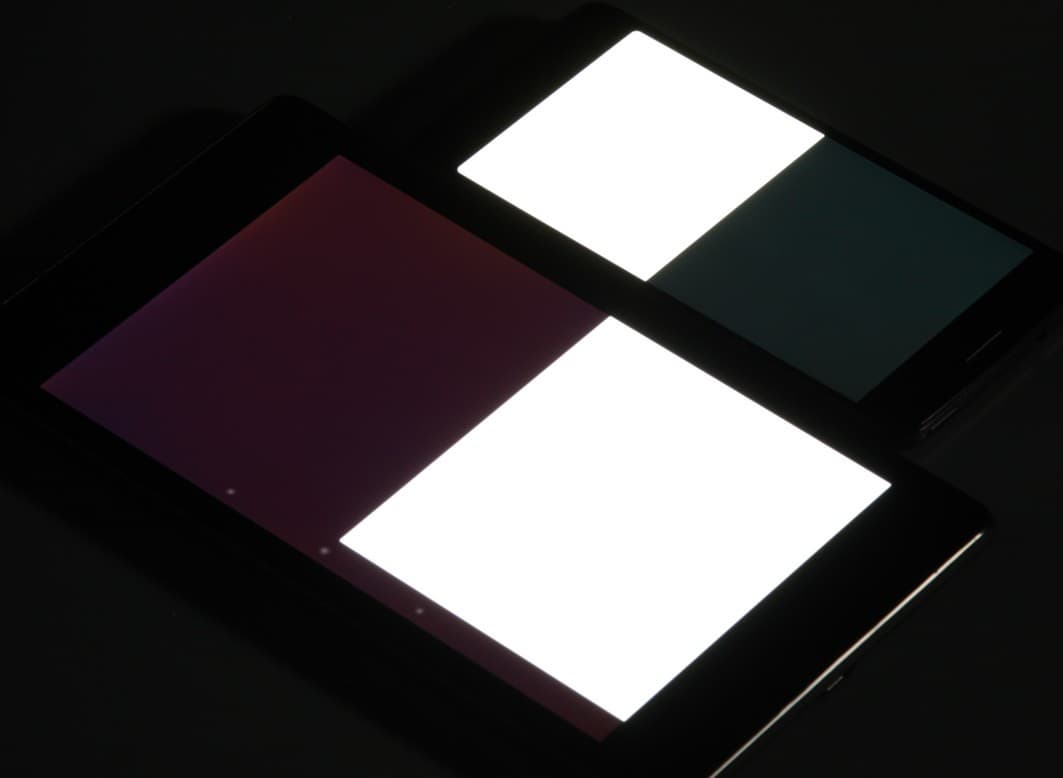 Яркость под углом у экранов уменьшилась (как минимум в 5 раз, исходя из разницы в выдержке) и уменьшилась примерно одинаково. Черное поле при отклонении по диагонали высветляется слабо и приобретает фиолетовый или красно-фиолетовый оттенок. Фотографии ниже это демонстрируют (яркость белых участков в перпендикулярном плоскости экранов направлении у экранов одинаковая!):