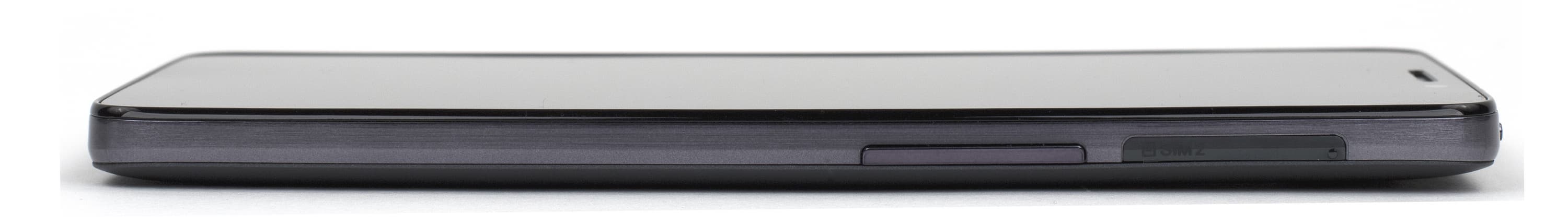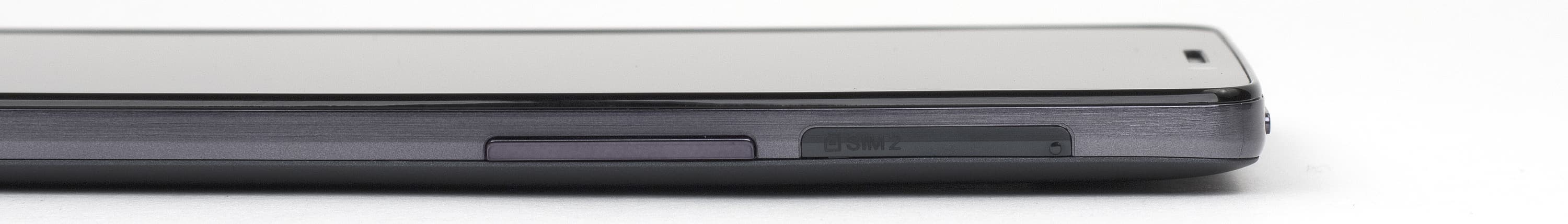 Механических аппаратных клавиш на боках устройства нашлось лишь две, и эти элементы управления, пожалуй, являются самым слабым местом описываемого смартфона. Во-первых, клавишу блокировки отчего-то разместили на верхнем торце — там, куда ни один из пальцев держащей смартфон руки не дотягивается. Во-вторых, обе клавиши имеют очень короткий и невнятный ход, мало выпирают из корпуса, поэтому при нажатии на них тактильного ощущения нет — это одни из самых неудобных виденных нами кнопок, и говорить о возможности работы с ними вслепую не приходится вовсе.