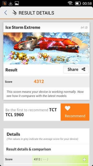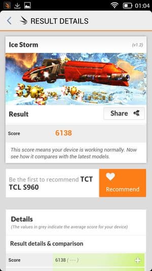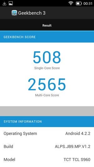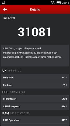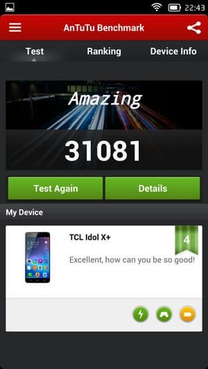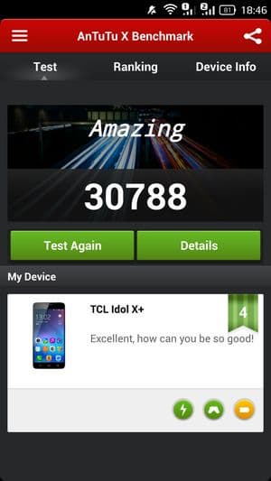 В целом смартфон TCL Idol X+ показал действительно весьма высокие результаты, если сравнивать с любыми другими соперниками, работа которых построена на платформах MediaTek, пусть даже самых современных и мощных. А вот если сравнивать результаты смартфона с лидерами рынка, то отставание от Qualcomm Snapdragon 800 все же заметно, хотя и несильное. Если опираться на цифры популярного бенчмарка AnTuTu, это выглядит приблизительно так: 31 тысяча баллов у TCL Idol X+ с частотой ядер 2 ГГц, 26 тысяч баллов у восьмиядерных Zopo 998 и THL T100S (частота процессорных ядер 1,7 ГГц) и около 35 тысяч у топовых смартфонов, таких как LG G2, Samsung Galaxy Note 3, Sony Xperia Z1, Acer Liquid S2 и других на аппаратной платформе Qualcomm Snapdragon 800. TCL Idol X+ — это первый смартфон на платформе MediaTek, который сумел практически вплотную подобраться к лидирующим решениям на Qualcomm.